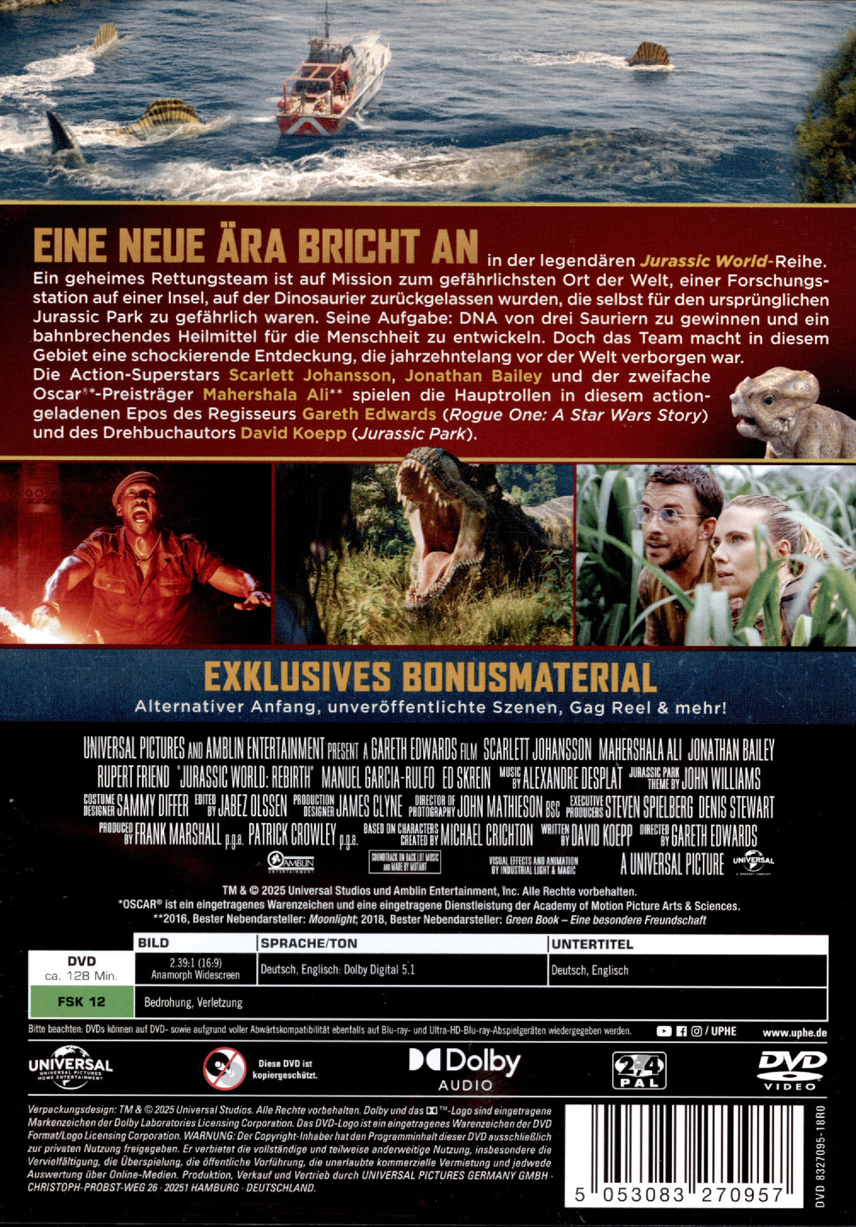 Eine neue Ära bricht an in der legendären "Jurassic World"-Reihe.Ein geheimes Rettungsteam ist auf Mission zum gefährlichsten Ort der Welt, einer Forschungsstation auf einer Insel, auf der Dinosaurier zurückgelassen wurden, die selbst für den ursprünglichen Jurassic Park zu gefährlich waren. Seine Aufgabe: DNA von drei Sauriern zu gewinnen und ein bahnbrechendes Heilmittel für die Menschheit zu entwickeln. Doch das Team macht in diesem Gebiet eine schockierende Entdeckung, die jahrzehntelang vor der Welt verborgen war.Die Action-Superstars Scarlett Johansson, Jonathan Bailey und der zweifache Oscar-Preisträger Mahershala Ali spielen die Hauptrollen in diesem actiongeladenen Epos des Regisseurs Gareth Edwards ("Rogue One: A Star Wars Story") und des Drehbuchautors David Koepp ("Jurassic Park").