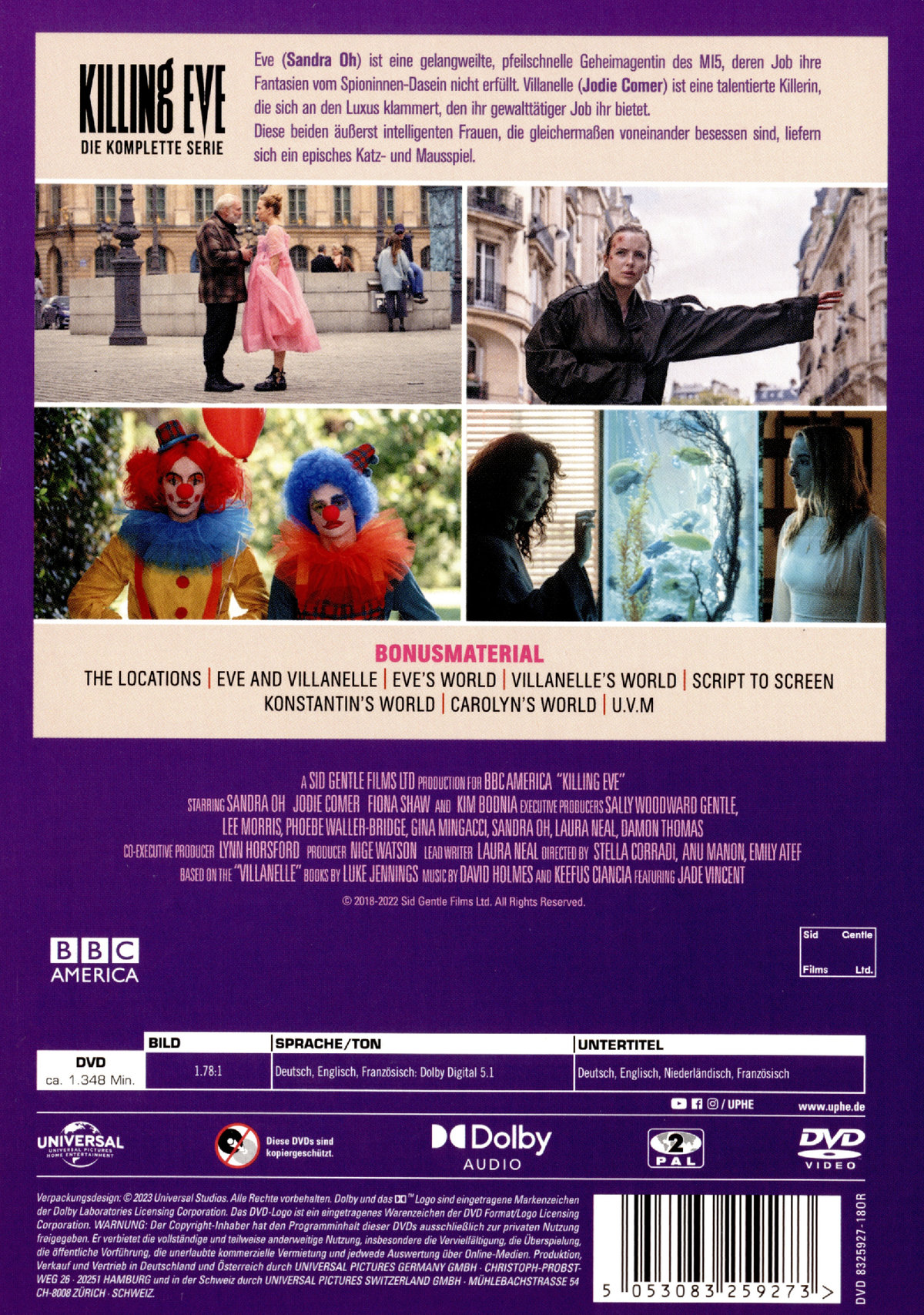 Eve (Sandra Oh) ist eine gelangweilte, pfeilschnelle Sicherheitsbeamtin des MI5, deren Job ihre Fantasien von einem Spionagejob nicht erfüllt. Villanelle (Jodie Comer) ist eine talentierte Killerin, die sich an den Luxus klammert, den ihr gewalttätiger Job ihr bietet. Diese beiden äußerst intelligenten Frauen, die gleichermaßen voneinander besessen sind, liefern sich ein episches Katz- und Mausspiel.Alle Episoden der 4 Staffeln auf 8 Discs.