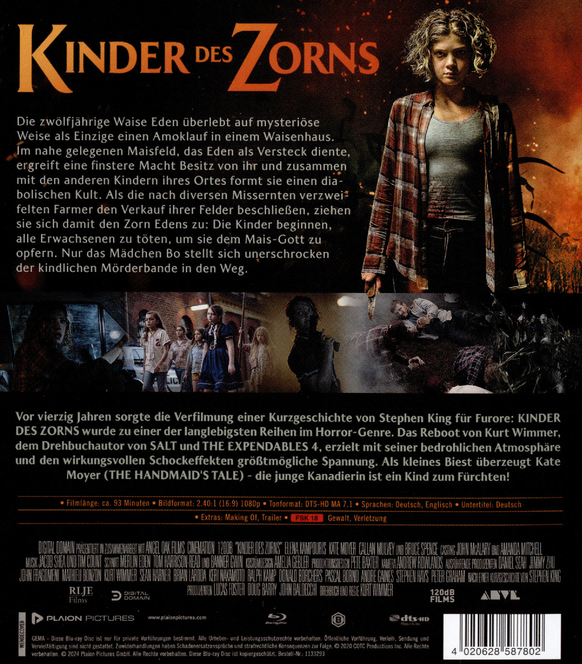 Vor vierzig Jahren sorgte die Verfilmung einer Kurzgeschichte von Stephen King für Furore: KINDER DES ZORNS wurde zu einer der langlebigsten Reihen im Horror-Genre. Das Reboot von Kurt Wimmer, dem Drehbuchautor von SALT und THE EXPENDABLES 4, erzielt mit seiner bedrohlichen Atmosphäre und den wirkungsvollen Schockeffekten größtmögliche Spannung. Als kleines Biest überzeugt Kate Moyer (THE HANDMAID'S TALE) - die junge Kanadierin ist ein Kind zum Fürchten!
