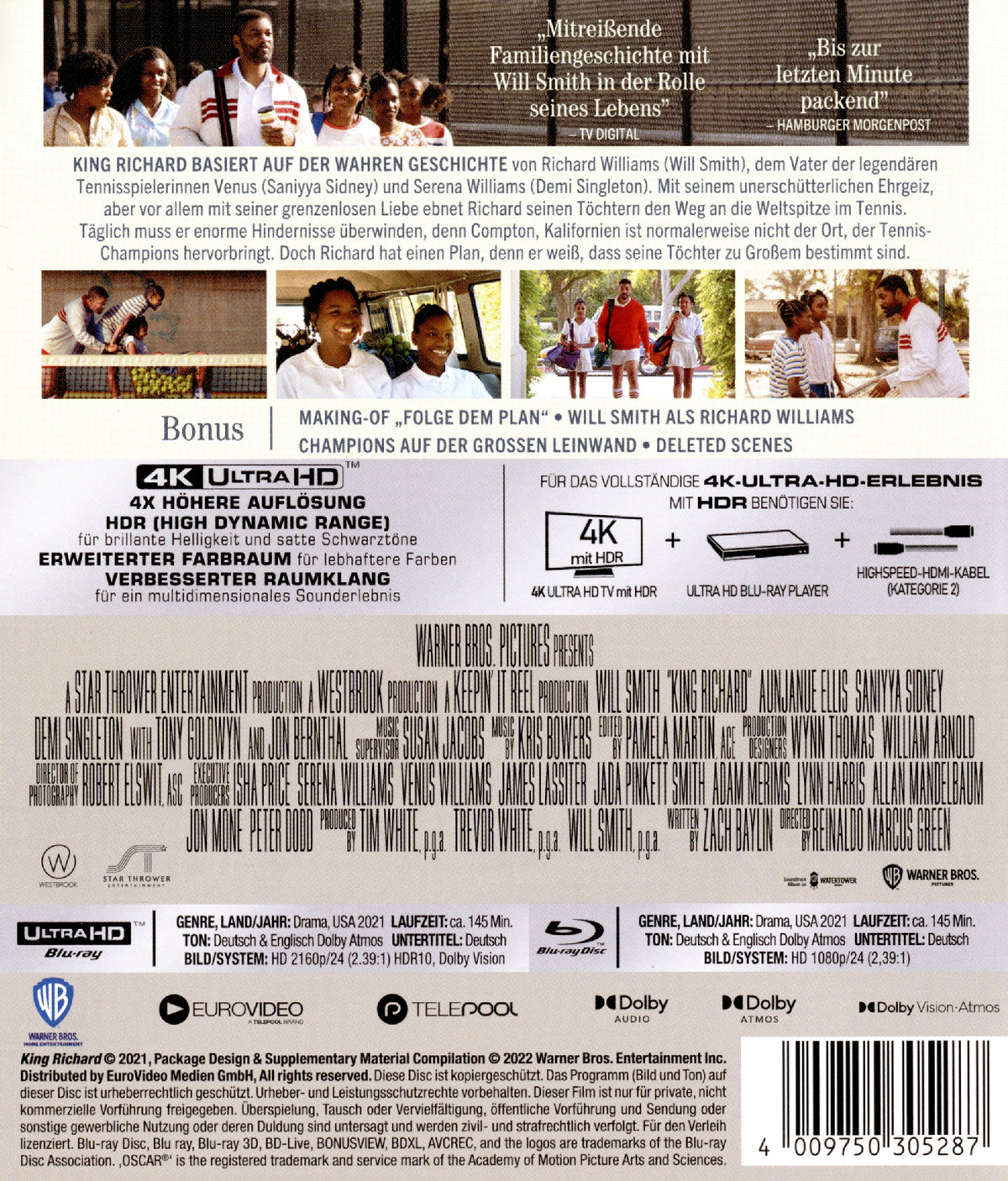 KING RICHARD basiert auf der wahren Geschichte von Richard Williams (Will Smith), dem Vater der legendären Tennisspielerinnen Venus (Saniyya Sidney) und Serena Williams (Demi Singleton). Um seinen Töchtern den Weg an die Spitze des Erfolgs zu ebnen, musste Richard enorme Hindernisse überwinden. Denn Compton, Kalifornien, ist normalerweise nicht der Ort, der Tennis-Champions hervorbringt. Aber Richard hat einen Plan. So fegt er die Spritzen der Drogenabhängigen von dem heruntergekommenen örtlichen Tennisplatz und wehrt sich tapfer gegen die Gangs, die den Platz als ihr Revier beanspruchen. Unermüdlich bringt er seinen Töchtern die Feinheiten eines Spiels bei, das er selbst nie gespielt hat und kämpft gegen die uralten Grenzlinien von Rasse und Klasse um eine faire Chance für seine Mädchen – Denn er weiß, dass sie zu Großem bestimmt sind.