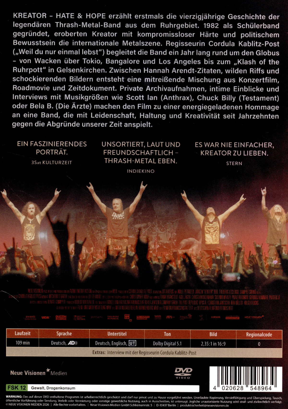 KREATOR – HATE & HOPE erzählt erstmals die vierzigjährige Geschichte der legendären Thrash-Metal-Band aus dem Ruhrgebiet. 1982 als Schülerband gegründet, eroberten Kreator mit kompromissloser Härte und politischem Bewusstsein die internationale Metalszene. Regisseurin Cordula Kablitz-Post („Weil du nur einmal lebst“) begleitet die Band ein Jahr lang rund um den Globus – von Wacken über Tokio, Bangalore und Los Angeles bis zum „Klash of the Ruhrpott“ in Gelsenkirchen. Zwischen Hannah Arendt-Zitaten, wilden Riffs und schockierenden Bildern entsteht eine mitreißende Mischung aus Konzertfilm, Roadmovie und Zeitdokument. Private Archivaufnahmen, intime Einblicke und Interviews mit Musikgrößen wie Scott Ian (Anthrax), Chuck Billy (Testament) oder Bela B. (Die Ärzte) machen den Film zu einer energiegeladenen Hommage an eine Band, die mit Leidenschaft, Haltung und Kreativität seit Jahrzehnten gegen die Abgründe unserer Zeit anspielt.