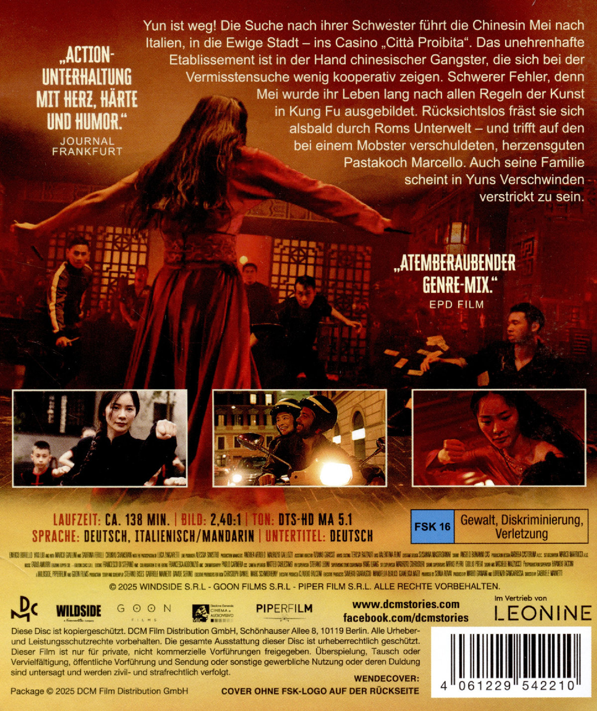Yun ist weg! Die Suche nach ihrer Schwester führt die Chinesin Mei nach Italien in die Ewige Stadt, ins Casino “Città Proibita“. Das unehrenhafte Etablissement ist in der Hand chinesischer Gangster, die sich bei der Vermisstensuche wenig kooperativ zeigen. Schwerer Fehler, denn Mei wurde ihr Leben lang nach allen Regeln der Kunst in Kung Fu ausgebildet. Rücksichtslos fräst sie sich alsbald durch Roms Unterwelt – und trifft auf den bei einem Mobster verschuldeten, herzensguten Pastakoch Marcello. Auch seine Familie scheint in Yuns Verschwinden verstrickt zu sein.