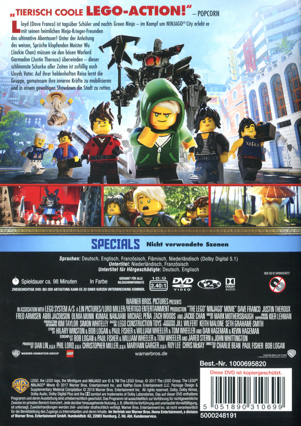 In diesem Ninjago-Kinoabenteuer ist der Kampf um Ninjago City entbrannt. Das bedeutet den Einsatz des jungen Lloyd alias Green Ninja und seiner Freunde, die insgeheim große Krieger und LEGO®-Meisterbauer sind. Unter der Leitung des weisen Sprücheklopfers und Kung-Fu-Meisters Wu bekämpfen sie den bösen Warlord Garmadon, den schlimmsten Schurken überhaupt, der zufällig auch Lloyds Vater ist. So kommt es zum Duell Mech gegen Mech, aber auch Vater gegen Sohn: Im gewaltigen Showdown wird sich zeigen, ob sich dieses ebenso ungestüme wie undisziplinierte Team aus modernen Ninjas bewährt. Denn sie alle müssen erst noch lernen, ihre Egos zu zügeln, um gemeinsam zu agieren und so ihre wahre Kraft zu entfalten.