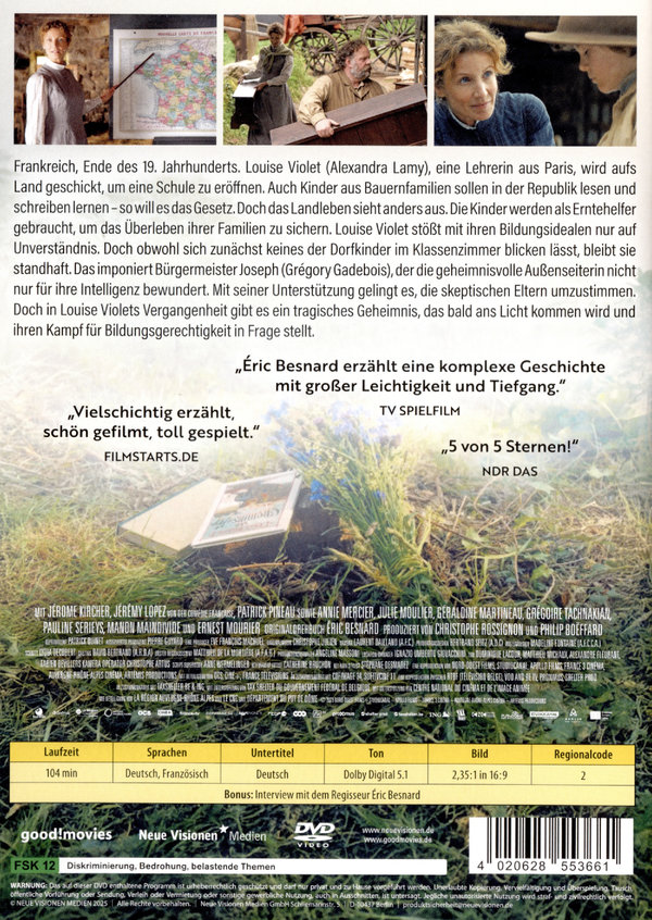 Frankreich, Ende des 19. Jahrhunderts. Louise Violet (Alexandra Lamy), eine Lehrerin aus Paris, wird aufs Land geschickt, um eine Schule zu eröffnen. Auch Kinder aus Bauernfamilien sollen in der Republik lesen und schreiben lernen – so will es das Gesetz. Doch das Landleben sieht anders aus. Die Kinder werden als Erntehelfer gebraucht, um das Überleben ihrer Familien zu sichern. Louise Violet stößt mit ihren Bildungsidealen nur auf Unverständnis. Doch obwohl sich zunächst keines der Dorfkinder im Klassenzimmer blicken lässt, bleibt sie standhaft. Nachdem er mit BIRNENKUCHEN MIT LAVENDEL, À LA CARTE! und DIE EINFACHEN DINGE bereits Millionen Zuschauer in Deutschland begeistert hat, kehrt Regisseur Éric Besnard mit LOUISE UND DIE SCHULE DER FREIHEIT auf die große Kinoleinwand zurück. Eine bewegende Tragikomödie, die von einer besseren Welt durch Bildung für alle träumt; und mit sanfter Strenge und viel Einfühlungsvermögen die Geschichte einer Frau erzählt, die sich für ihre Überzeugungen einsetzt. LOUISE UND DIE SCHULE DER FREIHEIT ist feinstes französisches Kino – mitreißend erzählt, von bestechender Klugheit und eingebettet in jene malerisch schönen Bildkompositionen, für die wir das Kino von Éric Besnard so lieben.