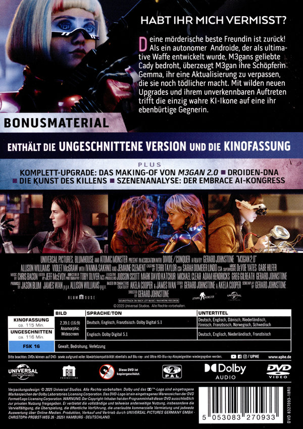 Enthält die ungeschnittene Version und die Kinofassung,Komplett-Upgrade: Das Making of von "M3gan 2.0",Droiden-DNA,Die Kunst des Killens,Szenenanalyse: Der Embrace AI-Kongress