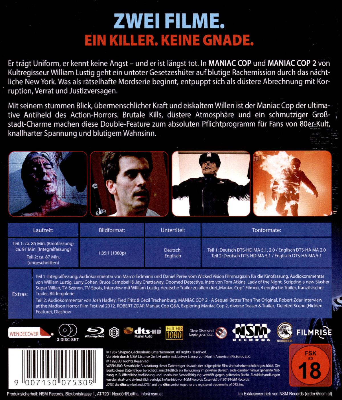 MANIAC COPdeutscher Audiokommentar von Marco Erdmann und Daniel Perée vom Wicked Vision Filmmagazin für die Kinofassung; Audiokommentar von William Lustig; Larry Cohen; Bruce Campbell und Jay Chattaway; Doomed Detective (Englisch mit deutschen Untertiteln); Intro von Tom Atkins (Englisch mit deutschen Untertiteln); Lady of the Night (Englisch mit deutschen Untertiteln); Scripting a new Slasher Super Villian (Englisch mit deutschen Untertiteln); TV-Szenen (Englisch mit deutschen Untertiteln); 2 TV-Spots; Interview mit William Lustig (Englisch mit deutschen Untertiteln); Deutsche Trailer zu allen drei "Maniac Cop"-Filmen; 4 englische Trailer; Französischer Trailer; BildergalerieMANIAC COP 2Audiokommentar von Josh Hadley; Fred Fritz; Cecil Trachenburg; MANIAC COP 2 ; A Sequel Better Than The Original; Robert Zdar Interview at the Madison Horror Film Festival 2012; ROBERT ZDAR Maniac Cop Q&A; Exploring Maniac Cop 2; Diverse Teaser & Trailer; Deleted Scene (Hidden Feature); Diashow