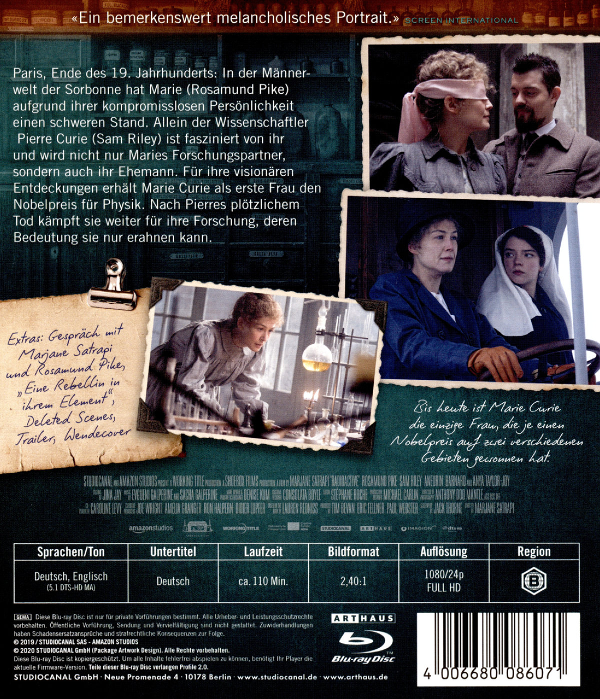 Paris, Ende des 19. Jahrhunderts: In der akademischen Männerwelt der Universität Sorbonne hat Marie Sk?odowska (Rosamund Pike) als Frau und auf Grund ihrer kompromisslosen Persönlichkeit einen schweren Stand. Allein der Wissenschaftler Pierre Curie (Sam Riley) ist fasziniert von ihrer Leiderschaft und Intelligenz und erkennt ihr Potential. Er wird nicht nur Maries Forschungspartner sondern auch ihr Ehemann und die Liebe ihres Lebens. Für ihre bahnbrechenden Entdeckungen erhält Marie Curie als erste Frau 1903 gemeinsam mit Pierre den Nobelpreis für Physik. Sein plötzlicher Tod erschüttert sie zutiefst, aber Marie gibt nicht auf. Sie kämpft für ein selbstbestimmtes Leben und für ihre Forschung, deren ungeheure Auswirkungen sie nur erahnen kann und die das 20. Jahrhundert entscheidend prägen werden.