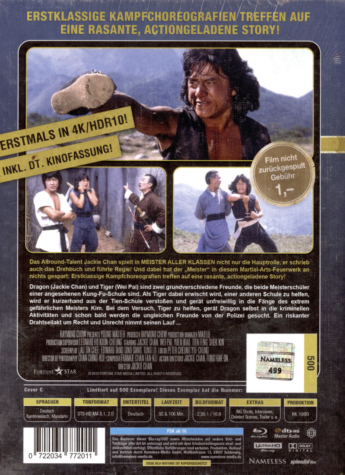 Das Allround-Talent Jackie Chan spielt in Meister aller Klassen nicht nur die Hauptrolle, er schrieb auch das Drehbuch und führte Regie! Und dabei hat der „Meister“ in diesem Martial-Arts-Feuerwerk an nichts gespart: Erstklassige Kampfchoreografien treffen auf eine rasante, actiongeladene Story! Dragon (Jackie Chan) und Tiger (Wei Pai) sind zwei grundverschiedene Freunde, die beide Meisterschüler einer angesehenen Kung-Fu-Schule sind. Als Tiger dabei erwischt wird, einer anderen Schule zu helfen, wird er kurzerhand aus der Tien-Schule verstoßen und gerät unfreiwillig in die Fänge des extrem gefährlichen Meisters Kim. Bei dem Versuch, Tiger zu helfen, gerät Dragon selbst in die kriminellen Aktivitäten und schon bald werden die ungleichen Freunde von der Polizei gesucht. Ein riskanter Drahtseilakt um Recht und Unrecht nimmt seinen Lauf …