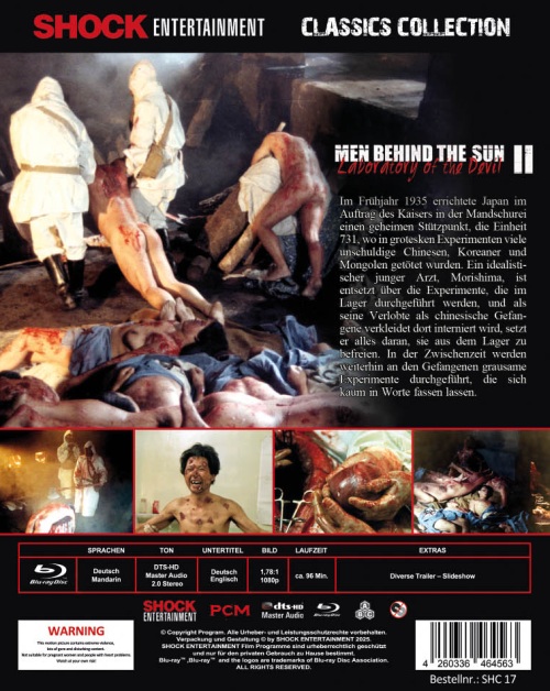 Inhaltsangabe: Im Frühjahr 1935 errichtete Japan im Auftrag des Kaisers in der Mandschurei einen geheimen Stützpunkt, die Einheit 731, wo in grotesken Experimenten viele unschuldige Chinesen, Koreaner und Mongolen getötet wurden. Ein idealistischer junger Arzt, Morishima, ist entsetzt über die Experimente, die im Lager durchgeführt werden, und als seine Verlobte als chinesische Gefangene verkleidet dort interniert wird, setzt er alles daran, sie aus dem Lager zu befreien. In der Zwischenzeit werden weiterhin an den Gefangenen grausame Experimente durchgeführt, die sich kaum in Worte fassen lassen. Mit "Men Behind The Sun 2: Laboratory Of The Devil" hat Godfrey Ho keine Fortsetzung im eigentlichen Sinn gedreht, sondern vielmehr eine Art Remake, das in seiner kompromisslosen Schonungslosigkeit dem Original in nichts nachsteht. Ein Film, der starke Mägen und Nerven erfordert.