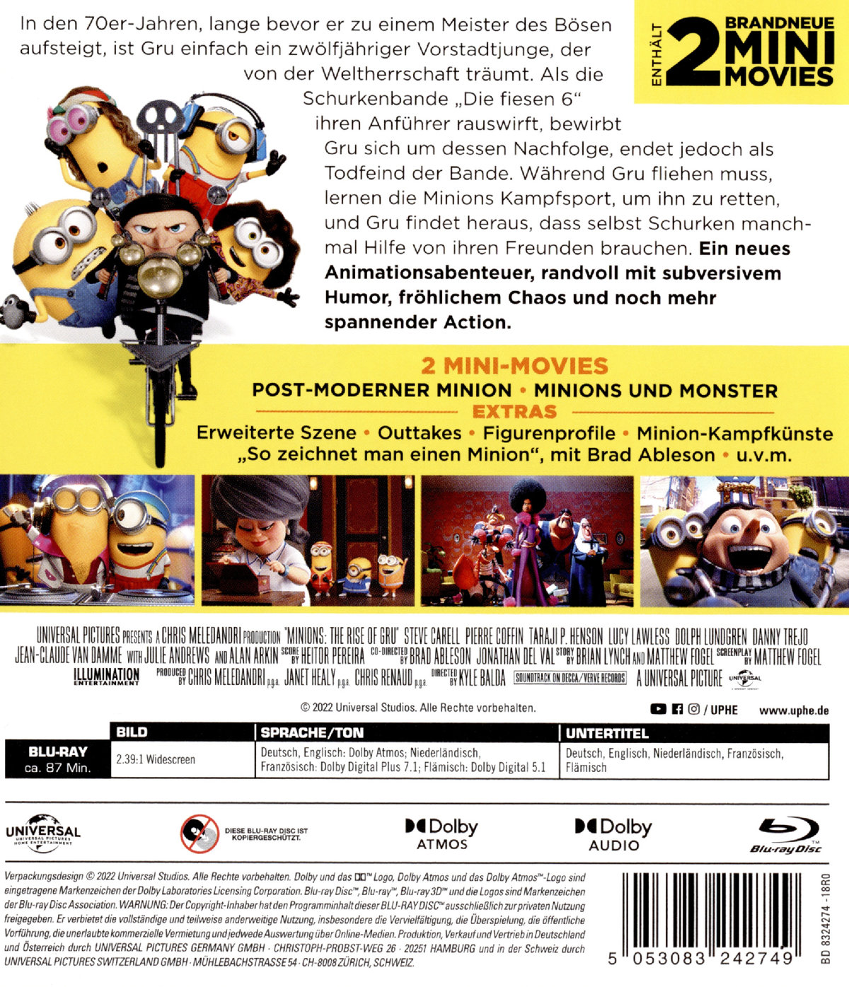 Mini-Movies: "Post-moderne Minions" & "Minions und Monster",Erweiterte Szene,Outtakes,Figurenprofile,Gruvige Animation,Die 70er - Mode, Essen & Funk,Minion-Kampfkünste,So zeichnet man einen Minion mit Brad Ableson,u.v.m.