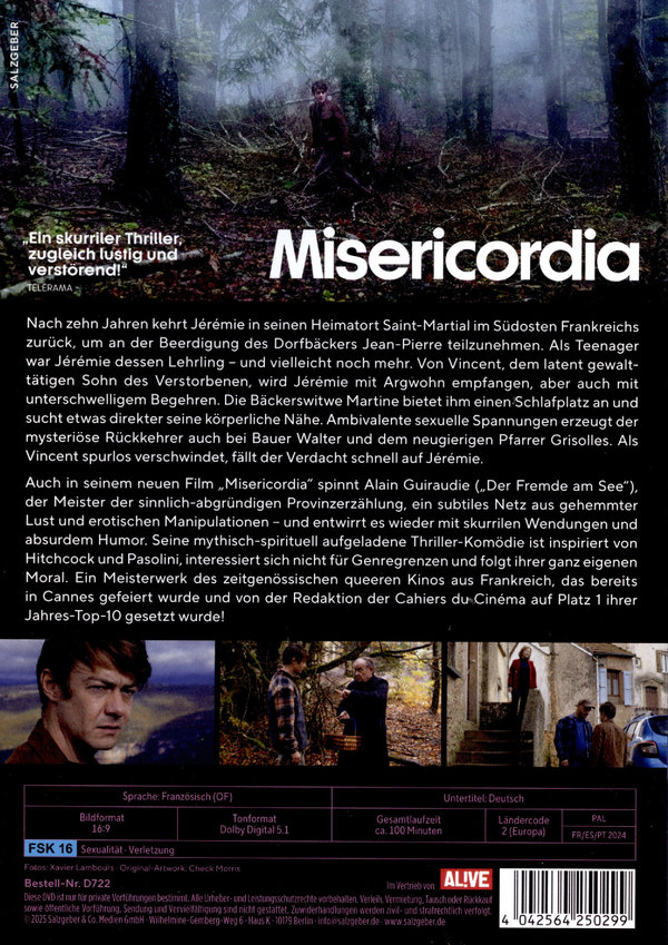 Nach zehn Jahren kehrt Jérémie in seinen Heimatort Saint-Martial im Südosten Frankreichs zurück, um an der Beerdigung des Dorfbäckers Jean-Pierre teilzunehmen. Als Teenager war Jérémie dessen Lehrling – und vielleicht noch mehr. Von Vincent, dem latent gewalttätigen Sohn des Verstorbenen, wird Jérémie mit Argwohn empfangen, aber auch mit unterschwelligem Begehren. Die Bäckerswitwe Martine bietet ihm einen Schlafplatz an und sucht etwas direkter seine körperliche Nähe. Ambivalente sexuelle Spannungen erzeugt der mysteriöse Rückkehrer auch bei Bauer Walter und dem neugierigen Pfarrer Grisolles. Als Vincent spurlos verschwindet, fällt der Verdacht schnell auf Jérémie. Auch in seinem neuen Film „Misericordia“ spinnt Alain Guiraudie („Der Fremde am See“), der Meister der sinnlich-abgründigen Provinzerzählung, ein subtiles Netz aus gehemmter Lust und erotischen Manipulationen – und entwirrt es wieder mit skurrilen Wendungen und absurdem Humor. Seine mythisch-spirituell aufgeladene Thriller-Komödie ist inspiriert von Hitchcock und Pasolini, interessiert sich nicht für Genregrenzen und folgt ihrer ganz eigenen Moral. Ein Meisterwerk des zeitgenössischen queeren Kinos aus Frankreich, das bereits in Cannes gefeiert wurde und von der Redaktion der Cahiers du Cinéma auf Platz 1 ihrer Jahres-Top-10 gesetzt wurde!