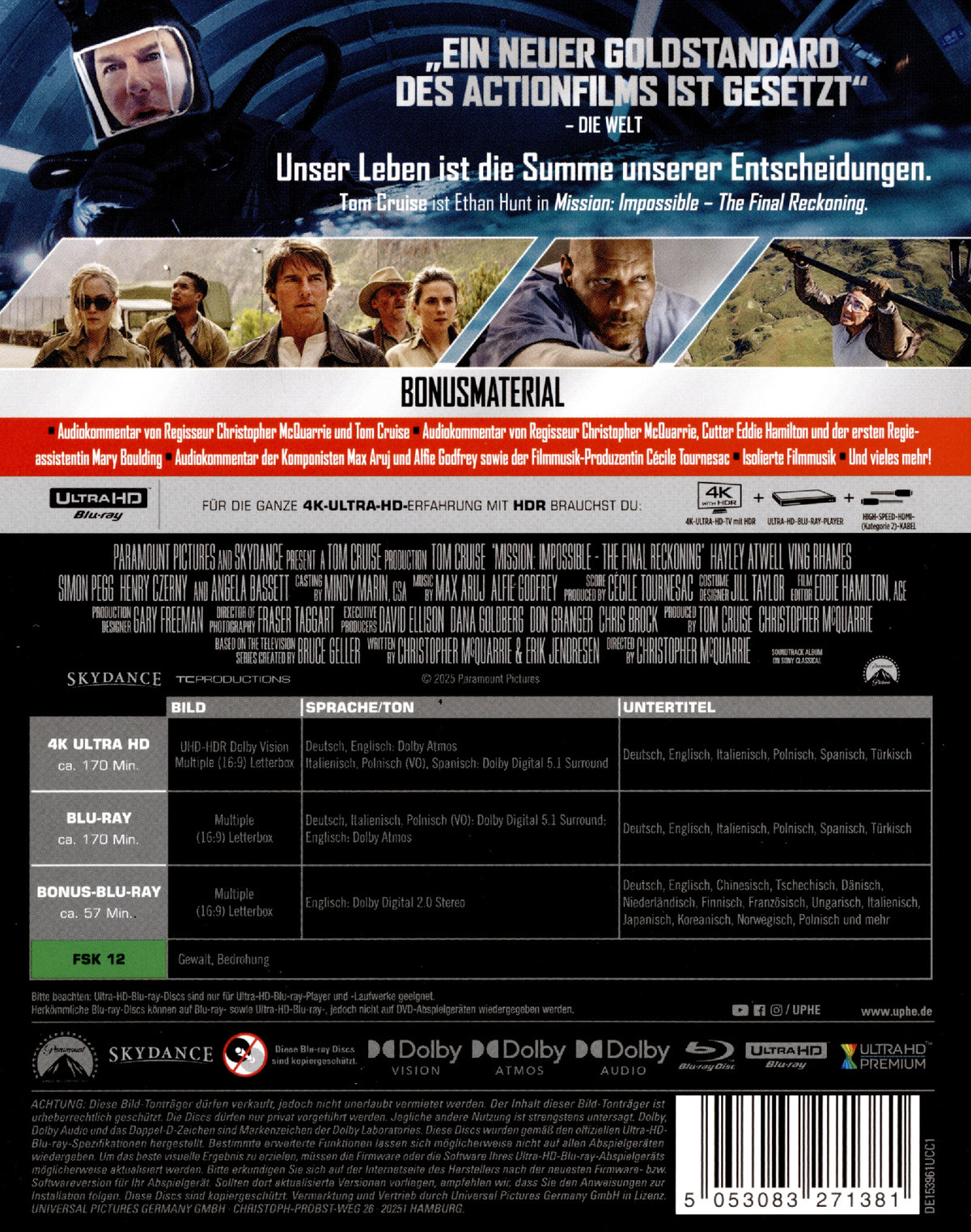 "Unser Leben ist die Summe unserer Entscheidungen." Tom Cruise ist Ethan Hunt in "Mission: Impossible - The Final Reckoning"An der Seite von Tom Cruise spielen Hayley Atwell, Ving Rhames, Simon Pegg, Vanessa Kirby, Esai Morales, Pom Klementieff, Mariela Garriga, Henry Czerny, Holt McCallany, Janet McTeer, Nick Offerman, Hannah Waddingham, Angela Bassett, Shea Whigham, Greg Tarzan Davis, Charles Parnell und Frederick Schmidt. Regie führte Christopher McQuarrie, basierend auf der von Bruce Geller kreierten Fernsehserie. Produzenten sind Tom Cruise und Christopher McQuarrie. Executive Producers sind David Ellison, Dana Goldberg, Don Granger und Chris Brock.