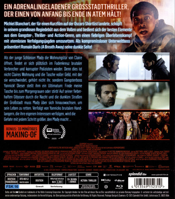 Als der junge Schlosser Mady die Wohnungstür von Claire öffnet, findet er sich plötzlich im Fadenkreuz brutaler Verbrecher und korrupter Polizisten wieder. Denn dies ist nicht Claires Wohnung und die Tasche voller Geld, mit der sie verschwindet, gehört nicht ihr, sondern Gangsterboss Yannick! Dieser stellt ihm ein Ultimatum: Finde meine Tasche bis zum Morgengrauen oder stirb! Auf seiner fieberhaften Odyssee durch die Nacht und die dunklen Straßen der Großstadt muss Mady über sich hinauswachsen, um sein Leben zu retten. Verfolgt von Yannicks brutalen Handlangern, die ihre eigenen Interessen verfolgen, wird die Gefahr mit jedem Schritt größer, den Mady macht …