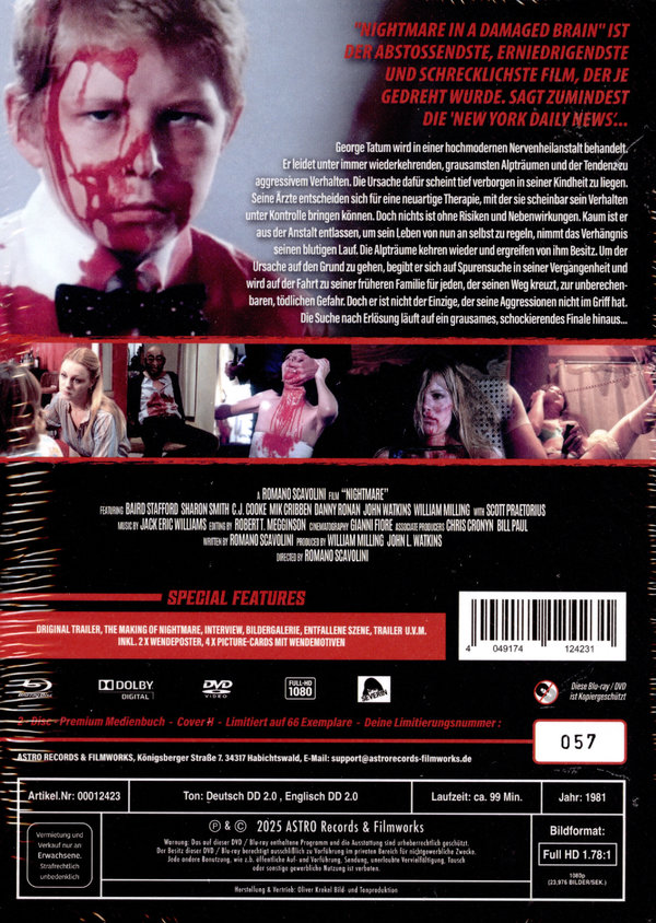 Er wurde indiziert. Er wurde sogar beschlagnahmt. Er wurde als „grafisch und unapologetisch“ (SexGoreMutants), „brutal effektiv“ (Screen Rant) und „ein vergessener Klassiker“ (Horror News) bezeichnet. Er ist nach wie vor der am meisten geschmähte, umstrittenste und missverstandenste Genrefilm der 80er Jahre. Jetzt kann man „den abstoßendsten, erniedrigendsten und schrecklichsten Film, der je gedreht wurde“ (NY Daily News) in neuer Qualität, so gut und so vollständig wie nie zuvor erleben. In 4K vom Internegativ abgetastet, sowie von anderen, verschiedenen ausländischen Quellen Remastered, bietet unsere Blu-ray ein unglaublich scharfes und detailreiches Bild, welches noch dazu die vollständigste Version die jemals zusammengestellt wurde päsentiert. Als ein geisteskranker Mörder (eine nachhaltig verstörende Leistung von Baird Stafford) aus einem experimentellen Drogenprogramm flieht, hinterlässt er eine fünftägige Spur psychosexuellen Gemetzels von den Peepshows der 42. Straße bis zu den blutgetränkten Ufern Floridas. Dieses „verheerende Meisterwerk“ (Cinefear) – dessen Veröffentlichung im Vereinigten Königreich unter dem Titel NIGHTMARES IN A DAMAGED BRAIN zur Inhaftierung des Verleihers David Hamilton-Grant führte – wurde von Romano Scavolini geschrieben und inszeniert. Special Features: Audio Commentary With Star Baird Staffordand Special Effects Assistant Cleve Hall Moderated By Lee Christian and David DeCoteau Audio Commentary With Producer William Paul Kill Thy Father And Thy Mother– Interview With Director Romano Scavolini (71 mins) Dreaming Up A Nightmare– Cast and Crew interviews. The Nightmare Of NIGHTMARE– Interview With Erroneously Credited Special Effects Director Tom Savini Deleted Scenes Still Gallery Trailer The Making Of Nightmare Interview mit Ed French Bildergalerie Artworkgalerie