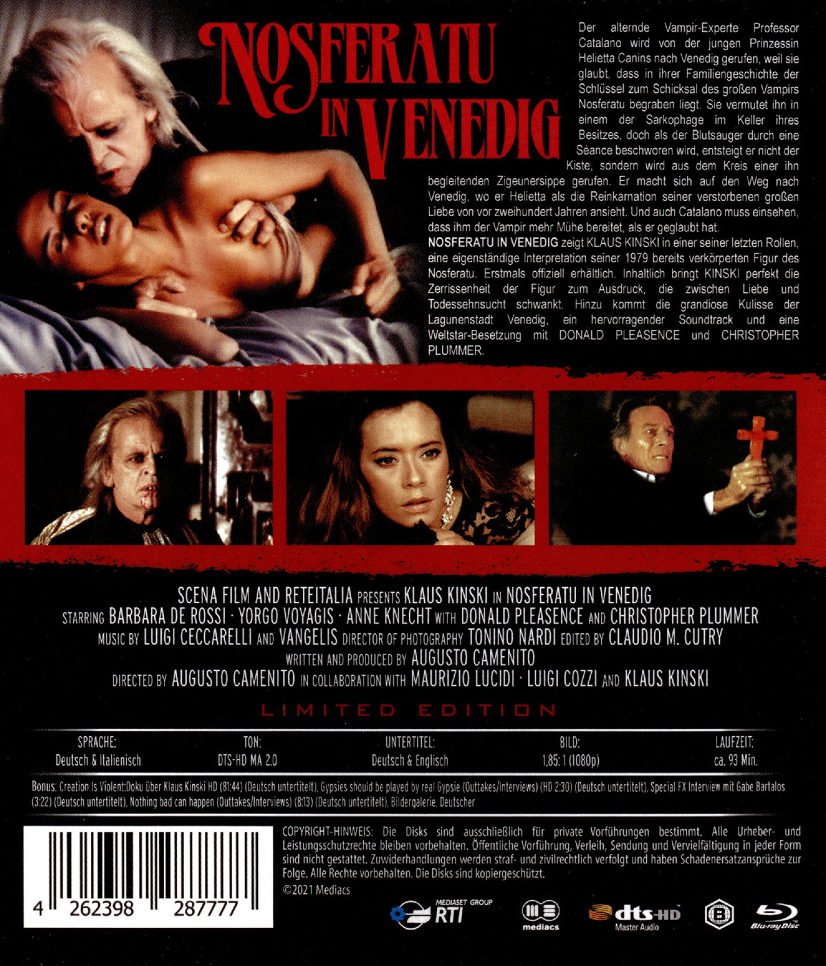 NOSFERATU IN VENEDIG zeigt KLAUS KINSKI in einer seiner letzten Rollen, eine eigenständige Interpretation seiner 1979 bereits verkörperten Figur des Nosferatu. Erstmals offiziell erhältlich. Inhaltlich bringt KINSKI perfekt die Zerrissenheit der Figur zum Ausdruck, die zwischen Liebe und Todessehnsucht schwankt. Hinzu kommt die grandiose Kulisse der Lagunenstadt Venedig, ein hervorragender Soundtrack und eine