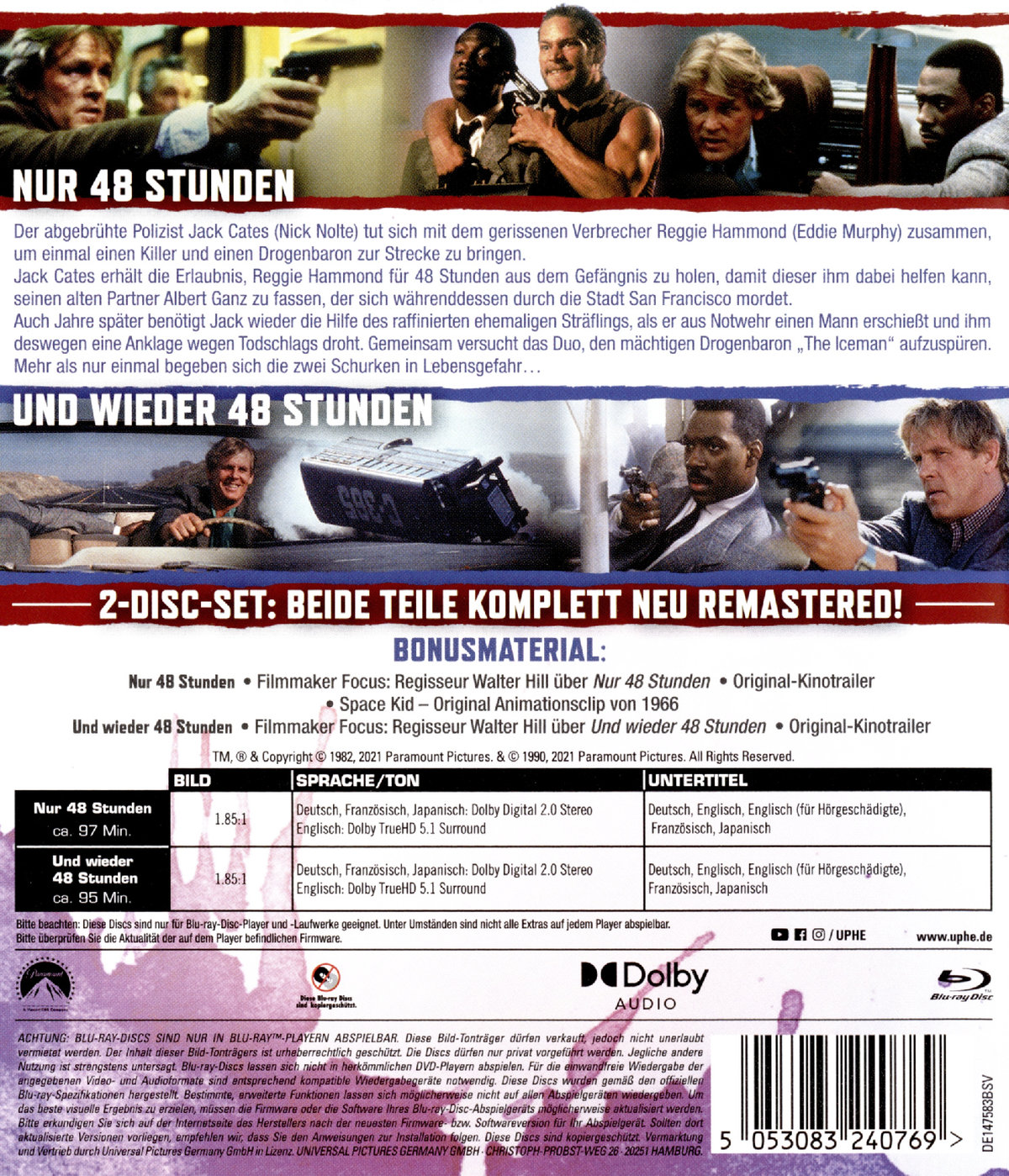 Nur 48 StundenJack Cates (Nick Nolte, "Hotel Ruanda", "Kap der Angst") und Reggie Hammond (Eddie Murphy, "Dr. Dolittle", "Beverly Hills Cop") würden sich niemals anfreunden - aber zu Partnern müssen sie wohl oder übel werden. Cates ist ein abgebrühter Bulle und einzig darauf aus, den Tod zweier Kollegen zu rächen. Hammond ist ein besserwisserischer Schwerverbrecher, der sich die gebunkerte Kohle von seinem letzten Coup unter den Nagel reißen will. Um die Mörder zur Strecke zu bringen, muss Cates deren Ex-Partner finden - Reggie.Wo liegt das Problem? Hammond sitzt im Knast. Cates muss seine Beziehungen spielen lassen, um für Reggie eine 48-stündige Bewährung zu bekommen ... und ihn zum Partner auf Zeit zu machen.Regisseur Walter Hill schickt Nolte und Murphy auf einen wilden Trip und setzt neue Standards bei diesem ultimativen Genre-Mix. Während ihres Wettlaufs mit der Zeit entdecken die Jungs eine Gemeinsamkeit: Beide würden töten, um die Killer zu finden ... wenn sie sich nicht vorher gegenseitig umbringen.Und wieder 48 StundenPolizist Jack Cates hat mächtig Ärger: Auf seiner Jagd nach dem mysteriösen Drogenbaron "Iceman" hat er wieder alle möglichen Polizeivorschriften missachtet und wird vom Dienst suspendiert. Er bekommt 48 Stunden, um "Iceman" hinter Gitter zu bringen, sonst ist er seinen Job endgültig los. Der einzige, der ihm dabei helfen kann, ist Reggie Hammond. Aber der sitzt mal wieder im Gefängnis. Als die beiden dann endlich wieder zusammen...