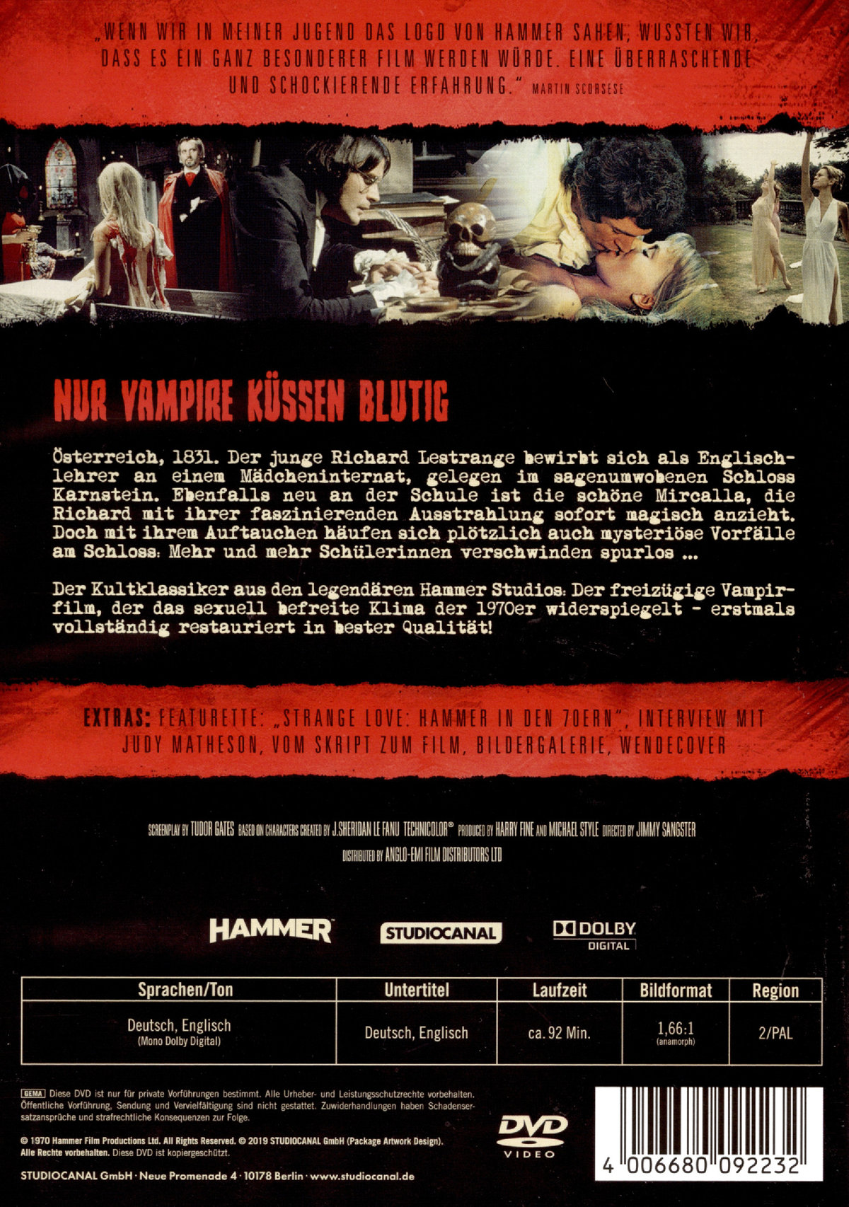 Ein freizügiger Vampirfilm der legendären Hammer Studios, der das sexuell befreite Klima der 1970er Jahre widerspiegelt. Das Drehbuch von Tudor Gates basiert auf Motiven der Novelle "Carmilla, der weibliche Vampir" (1872) von Sheridan Le Fanu. NUR VAMPIRE KÜSSEN BLUTIG ist nach „Gruft der Vampire“ (1970) der zweite Teil der „Karnstein“-Trilogie, auf den 1971 schließlich noch „Draculas Hexenjagd“ als dritter und letzter Teil folgte.