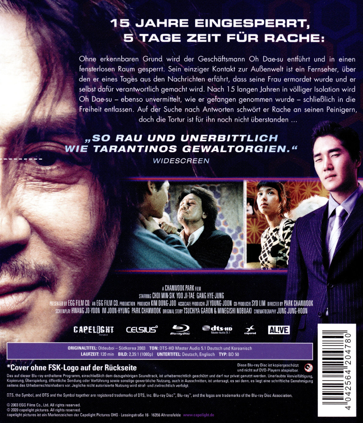 15 Jahre eingesperrt, 5 Tage Zeit für Rache: Ohne erkennbaren Grund wird der Geschäftsmann Oh Dae-su entführt und in einen fensterlosen Raum gesperrt. Sein einziger Kontakt zur Außenwelt ist ein Fernseher, über den er eines Tages aus den Nachrichten erfährt, dass seine Frau ermordet wurde und er selbst dafür verantwortlich gemacht wird. Nach 15 langen Jahren in völliger Isolation wird Oh Dae-su - ebenso unvermittelt, wie er gefangen genommen wurde - schließlich in die Freiheit entlassen. Auf der Suche nach Antworten schwört er Rache an seinen Peinigern, doch die Tortur ist für ihn noch nicht überstanden ...