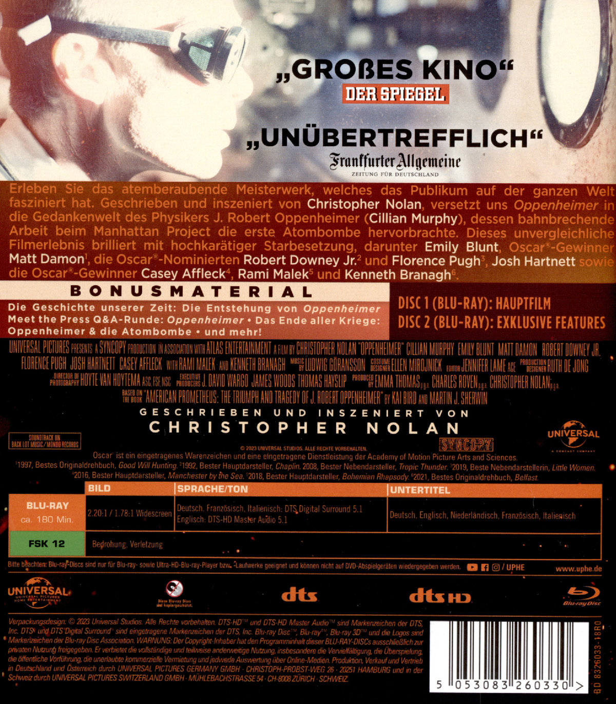 Inkl. Bonus Disc: Die Geschichte unserer Zeit: Die Entstehung von "Oppenheimer",Innovationen beim Film: 65-MM-Schwarz-Weiß-Film in "Oppenheimer",Das Ende aller Kriege: Oppenheimer und die Atombombe,Meet the Press: Q&A-Runde,Trailer