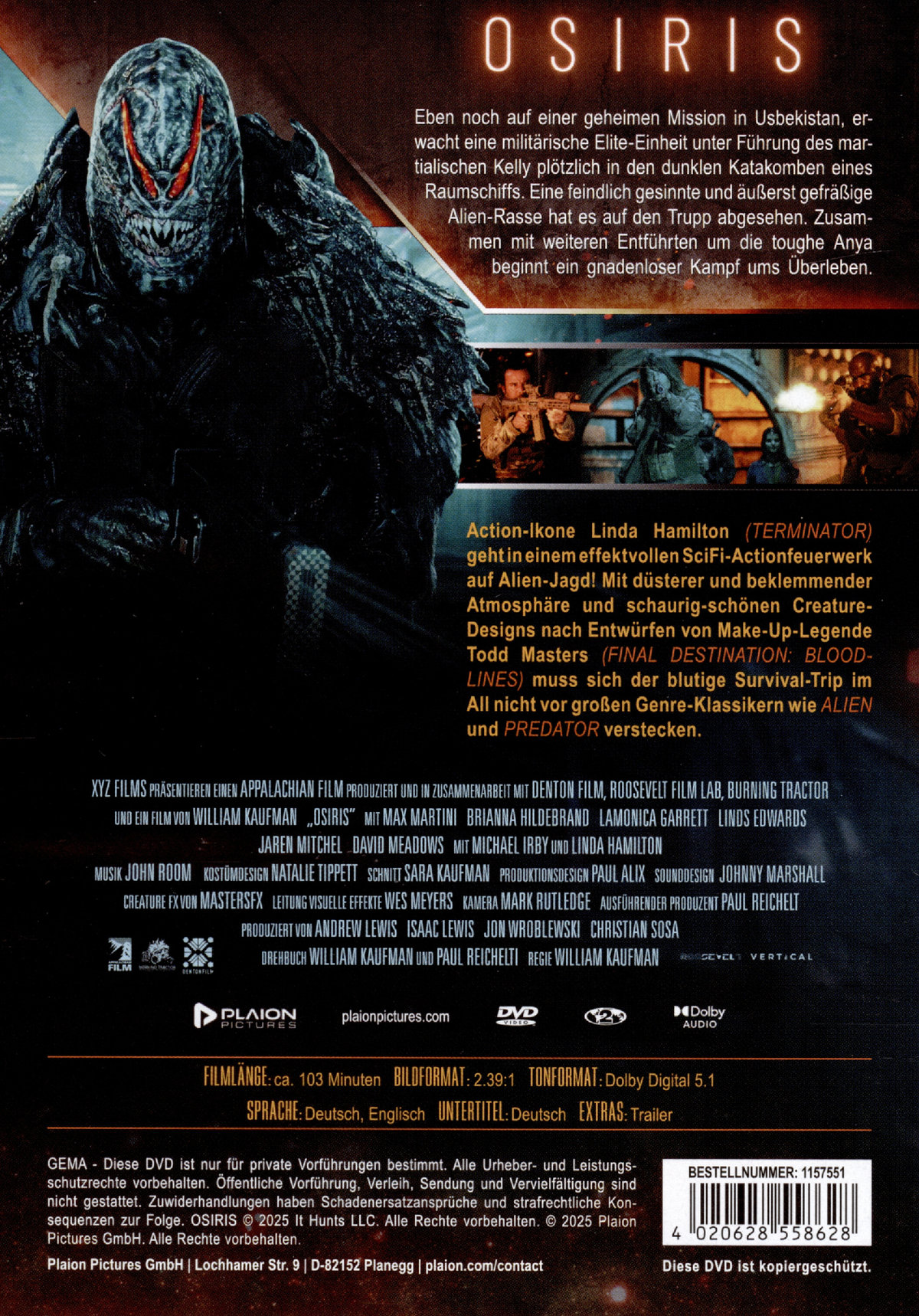 Action-Ikone Linda Hamilton (TERMINATOR) geht in einem effektvollen SciFi-Actionfeuerwerk auf Alien-Jagd! Mit düsterer und beklemmender Atmosphäre und schaurig-schönen Creature-Designs nach Entwürfen von Make-Up-Legende Todd Masters (FINAL DESTINATION: BLOODLINES) muss sich der blutige Survival-Trip im All nicht vor großen Genre-Klassikern wie ALIEN und PREDATOR verstecken.