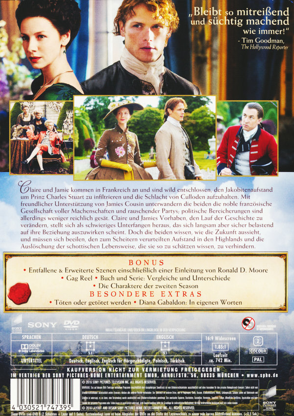 In der 2. Staffel von Outlander landen Claire und Jamie in Frankreich. Ihr Ziel ist es, den jakobitischen Aufstand unter der Führung von Prinz Charles Stuart zu infiltrieren und die Schlacht von Culloden zu verhindern. Mit Hilfe seines Cousins Jared, einem Pariser Weinhändler, finden Jamie und Claire Zugang zum pompösen Gesellschaftsleben am französischen Hof. Dort kommt es zwar zu zahlreichen Intrigen und ausschweifenden Feierlichkeiten, doch der politische Erfolg bleibt gering. Den Kurs der Geschichte zu Verändern bringt Herausforderungen mit sich, die schwer auf Claires und Jamies Beziehung lasten. Trotzdem riskieren die beiden alles, um den zum Scheitern verurteilten Aufstand der Highlander und die Auslöschung des schottischen Lebens, wie sie es kennen, zu verhindern. Und dann ist da noch Claires Ehemann Frank. Er hat die Liebe seines Lebens nie aufgegeben - und er wird sie bald wiedersehen ...