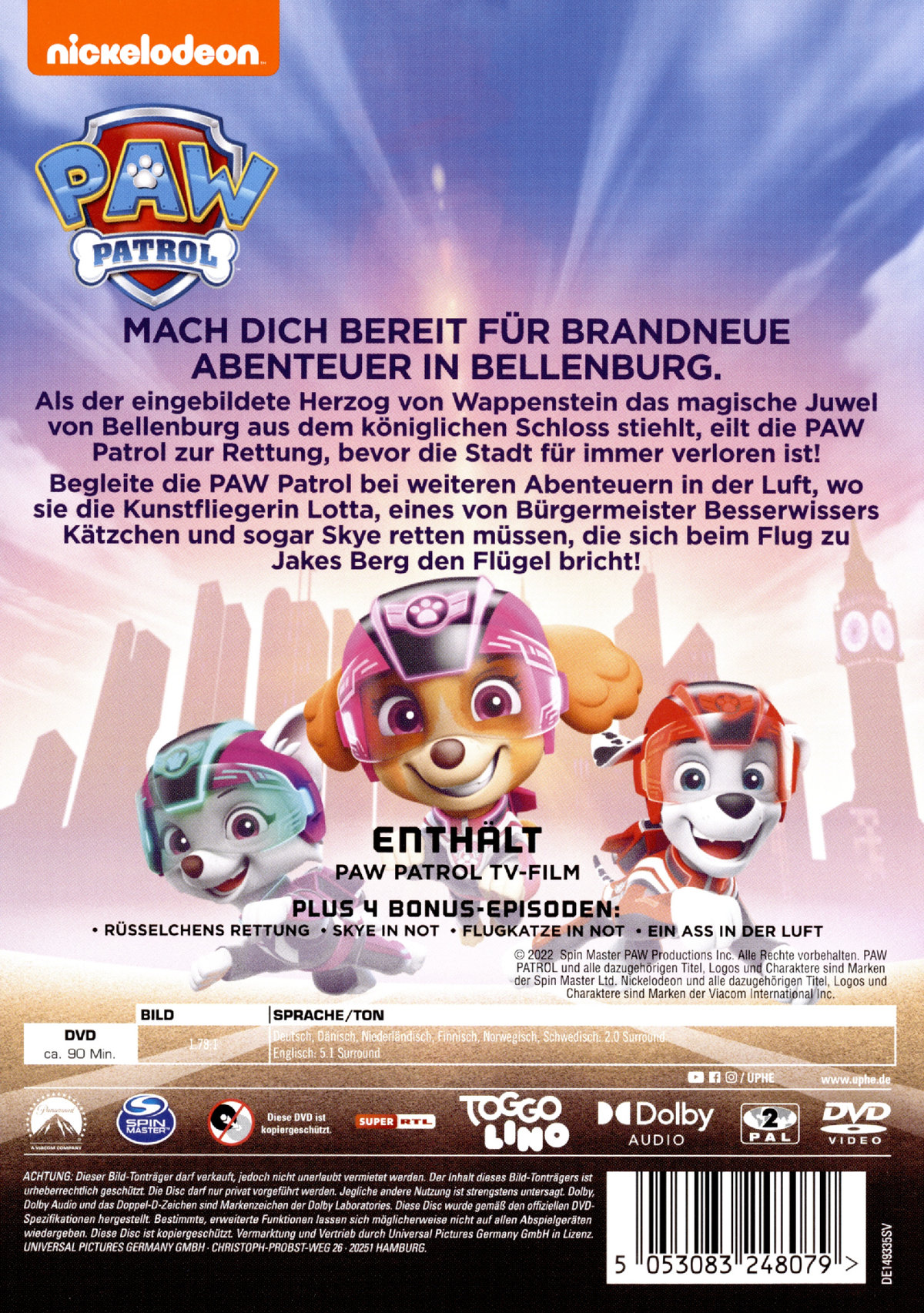 Als der eingebildete Herzog von Wappenstein das magische Juwel von Bellenburg aus dem königlichen Schloss stiehlt, eilt die "PAW Patrol" zur Rettung, bevor die Stadt für immer verloren ist! Begleite die "PAW Patrol" bei weiteren Abenteuern in der Luft, wo sie die Kunstfliegerin Lotta, eines von Bürgermeister Besserwissers Kätzchen und sogar Skye retten müssen, die sich beim Flug zu Jakes Berg den Flügel bricht!
