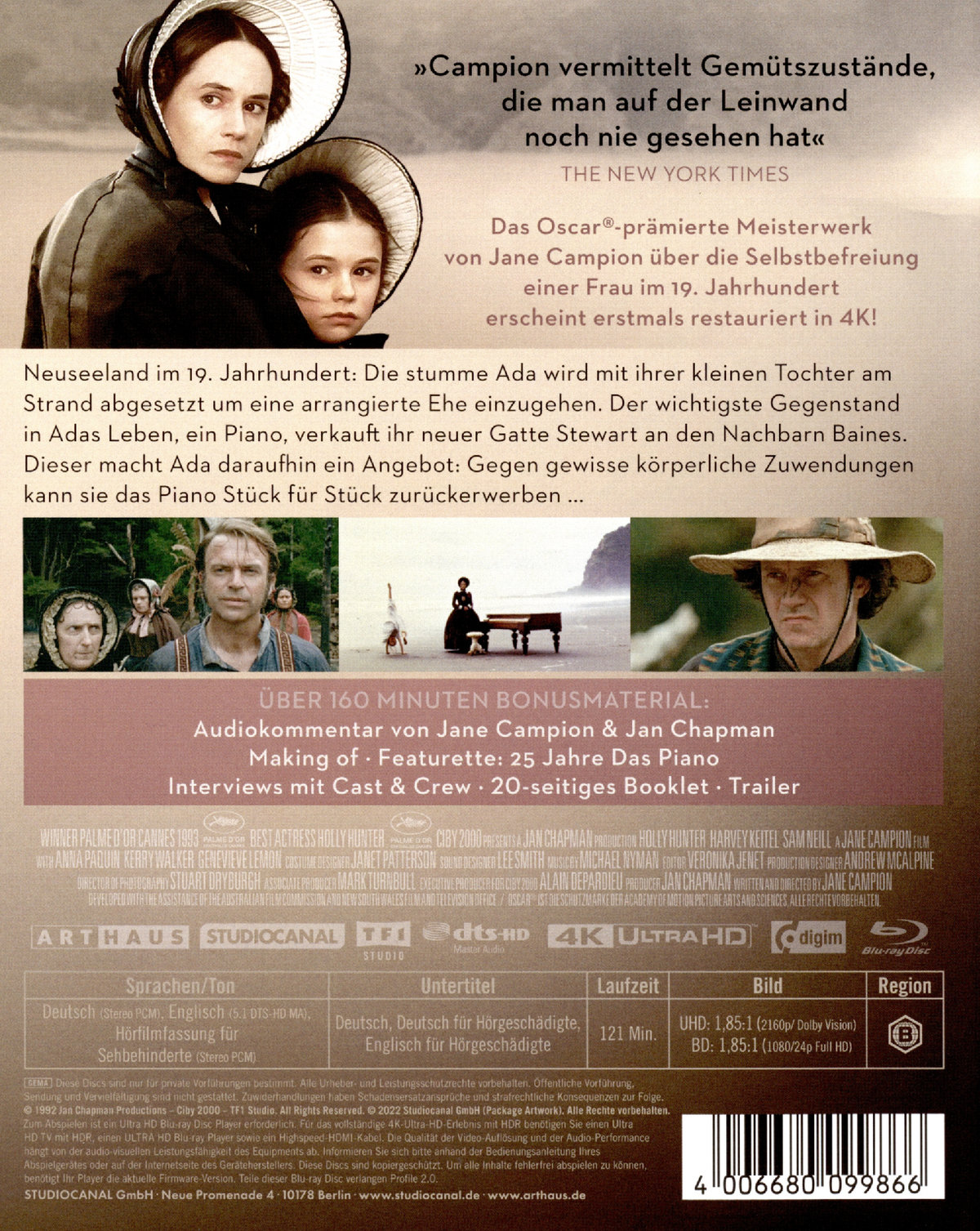 Das einfühlsame und bildgewaltig inszenierte Meisterwerk von Drehbuchautorin und Regisseurin Jane Campion wurde mit drei Oscars®, einem Golden Globe® und der Goldenen Palme in Cannes prämiert. Die Top-Besetzung des Dramas vereint mit Oscar®-Preisträgerin Holly Hunter, Harvey Keitel und Sam Neill echte Hollywood-Größen in den Hauptrollen. Der unverwechselbare Soundtrack stammt von Komponist Michael Nyman, die atemberaubenden Landschaftsaufnahmen verantwortete der Oscar®-nominierte Kameramann Stuart Dryburgh.