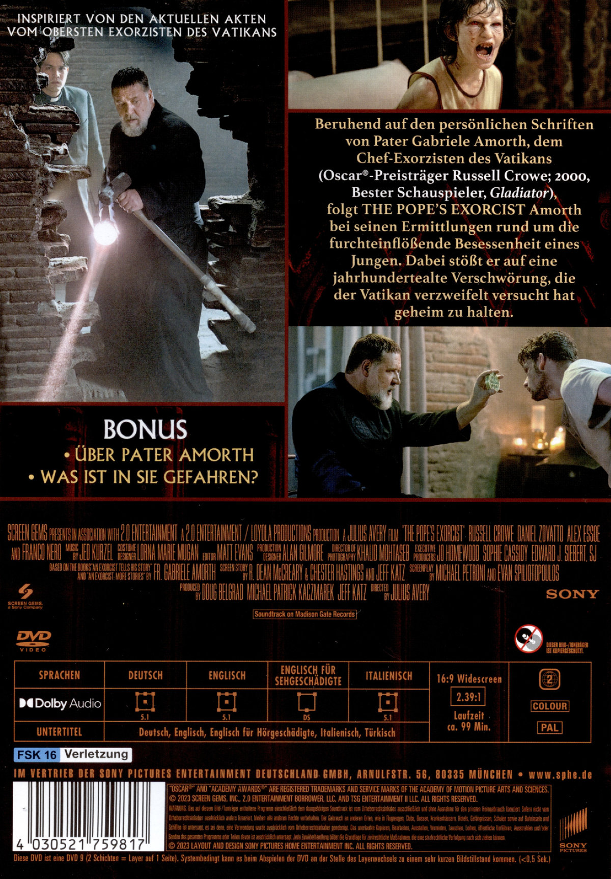 Australiens Kinolegende Russell Crowe (GLADIATOR) spielt die Hauptrolle in diesem übernatürlichen Horrorthriller. An seiner Seite agieren Daniel Zovatto (DON’T BREATHE) und DJANGO-Legende Franco Nero als Papst. Regisseur Julius Avery (OPERATION: OVERLORD) inszenierte den Exorzisten-Schocker mit unglaublichen Spezialeffekten und betörend schönen Bildern.