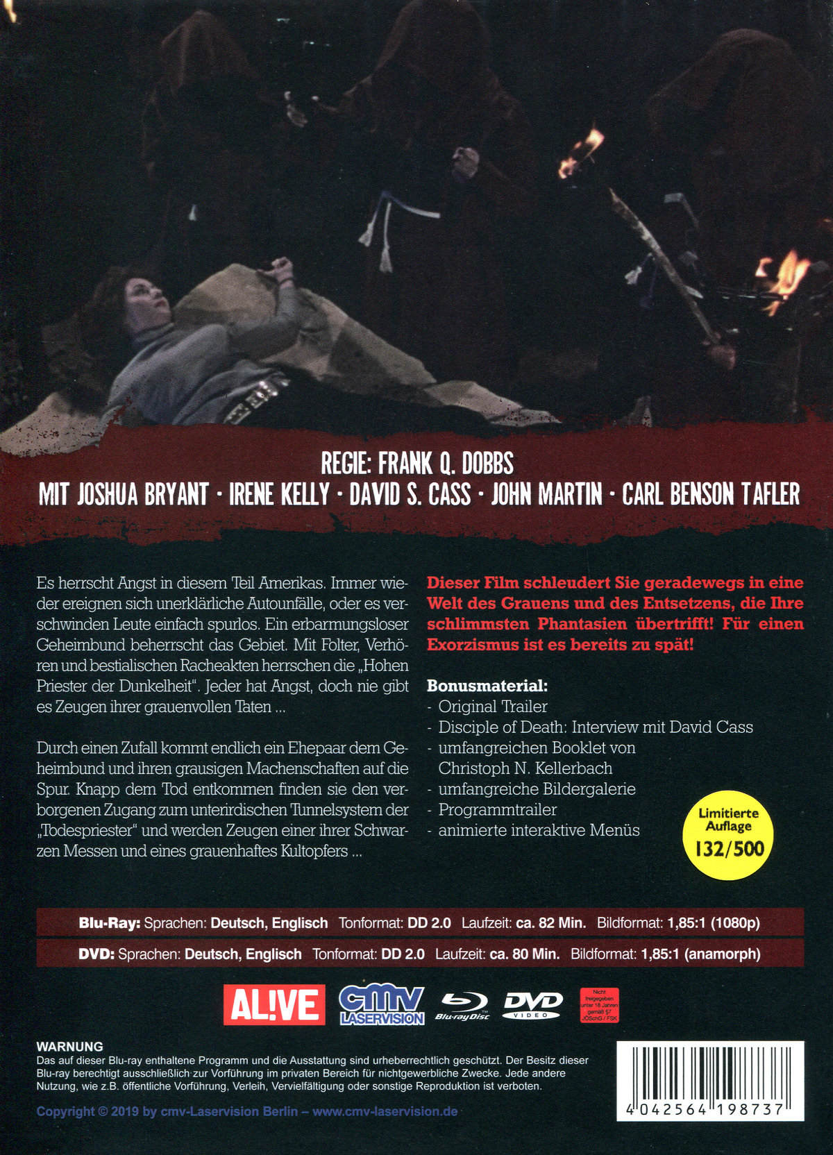Es herrscht Angst in diesem Teil Amerikas. Immer wieder ereignen sich unerklärliche Autounfälle, oder es verschwinden Leute einfach spurlos! Ein erbarmungsloser Geheimbund beherrscht das Gebiet. Mit Folter, Verhören und bestialischen Racheakten herrschen die "Hohen Priester der Dunkelheit". Jeder hat Angst, doch nie gibt es Zeugen ihrer grauenvollen Taten ... Durch einen Zufall kommt endlich ein Ehepaar dem Geheimbund und ihren grausigen Machenschaften auf die Spur. Knapp dem Tod entkommen finden sie den verborgenen Zugang zum unterirdischen Tunnelsystem der "Todespriester" und werden Zeugen einer ihrer Schwarzen Messen und eines grauenhaftes Kultopfers. Dieser Film schleudert Sie geradewegs in eine Welt des Grauens und des Entsetzens, die Ihre schlimmsten Phantasien übertrifft! Für einen Exorzismus ist es bereits zu spät!