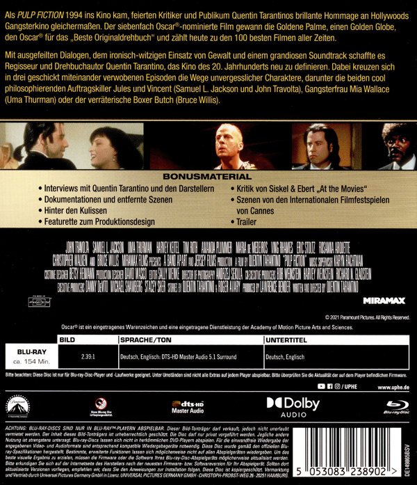 Als "Pulp Fiction" 1994 ins Kino kam, feierten Kritiker und Publikum Quentin Tarantinos brillante Hommage an Hollywoods Gangsterkino gleichermaßen. Der siebenfach Oscar®-nominierte Film gewann die Goldene Palme, einen Golden Globe, den Oscar® für das "Beste Originaldrehbuch" und zählt heute zu den 100 besten Filmen aller Zeiten.Mit ausgefeilten Dialogen, dem ironisch-witzigen Einsatz von Gewalt und einem grandiosen Soundtrack schaffte es Regisseur und Drehbuchautor Quentin Tarantino, das Kino des 20. Jahrhunderts neu zu definieren. Dabei kreuzen sich in drei geschickt miteinander verwobenen Episoden die Wege unvergesslicher Charaktere, darunter die beiden cool philosophierenden Auftragskiller Jules und Vincent (Samuel L. Jackson und John Travolta), Gangsterfrau Mia Wallace (Uma Thurman) oder der verräterische Boxer Butch (Bruce Willis).