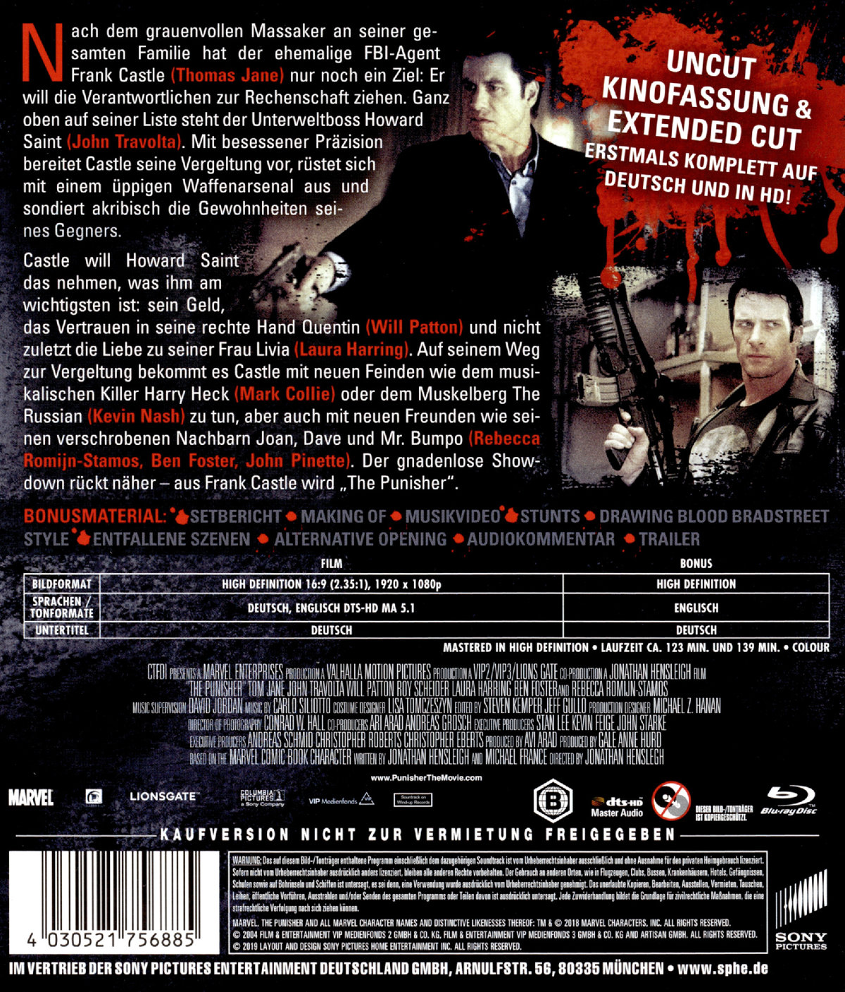 Nach dem grauenvollen Massaker an seiner gesamten Familie hat der ehemalige FBI-Agent Frank Castle (Tom Jane) nur noch ein Ziel: Er will die Verantwortlichen zur Rechenschaft ziehen. Ganz oben auf seiner Liste steht der Unterweltboss Howard Saint (John Travolta). Mit besessener Präzision bereitet Castle seine Vergeltung vor, rüstet sich mit einem üppigen Waffenarsenal aus und sondiert akribisch die Gewohnheiten seines Gegners. Castle will Howard Saint das nehmen, was ihm am wichtigsten ist: sein Geld, das Vertrauen in seine rechte Hand Quentin (Will Patton) und nicht zuletzt die Liebe zu seiner Frau Livia (Laura Harring). Auf seinem Weg zur Vergeltung bekommt es Castle mit neuen Feinden wie dem musikalischen Killer Harry Heck (Mark Collie) oder dem Muskelberg The Russian (Kevin Nash) zu tun, aber auch mit neuen Freunden wie seinen verschrobenen Nachbarn Joan, Dave und Mr. Bumpo (Rebecca Romijn-Stamos, Ben Foster, John Pinette). Der gnadenlose Showdown rückt näher - aus Frank Castle wird "The Punisher". Drehbuchautor Jonathan Hensleigh (Armageddon) liefert in seinem Regiedebüt ein überwältigendes Actionduell! Uncut Version ca. 123 Minuten Extended Cut ca. 139 Minuten