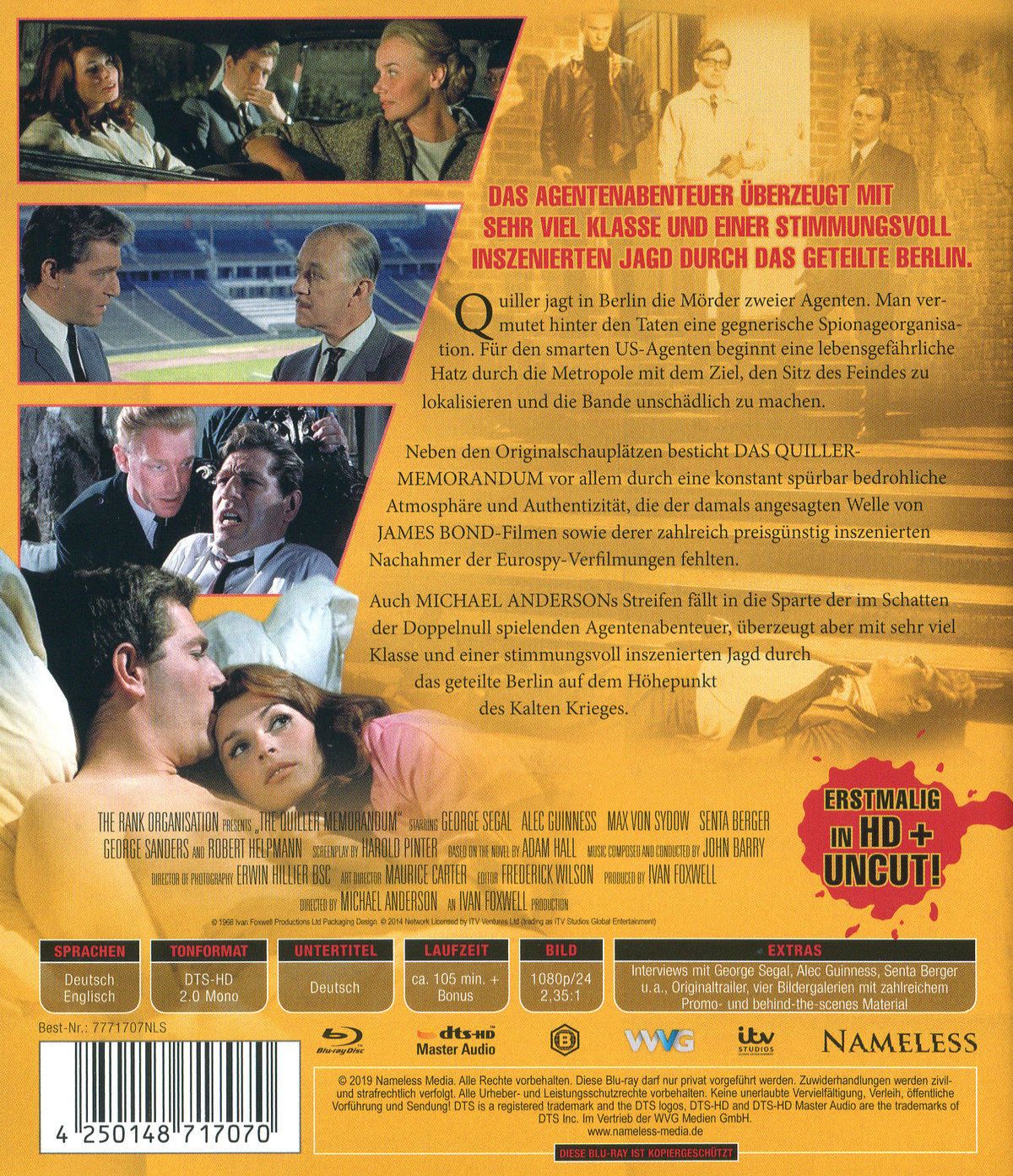 Quiller jagt in Berlin die Mörder zweier Agenten. Man vermutet hinter den Taten eine gegnerische Spionageorganisation. Für den smarten US-Agenten beginnt eine lebensgefährliche Hatz durch die Metropole mit dem Ziel, den Sitz des Feindes zu lokalisieren und die Bande unschädlich zu machen. Neben den Originalschauplätzen besticht DAS QUILLERMEMORANDUM vor allem durch eine konstant spürbar bedrohliche Atmosphäre und Authentizität, die der damals angesagten Welle von JAMES BOND-Filmen sowie derer zahlreich preisgünstig inszenierten Nachahmer der Eurospy-Verfilmungen, fehlten. Auch MICHAEL ANDERSONs Streifen fällt in die Sparte der im Schatten der Doppelnull spielenden Agentenabenteuer,überzeugt aber mit sehr viel Klasse und einer stimmungsvoll inszenierten Jagd durch das geteilte Berlin auf dem Höhepunkt des Kalten Krieges.