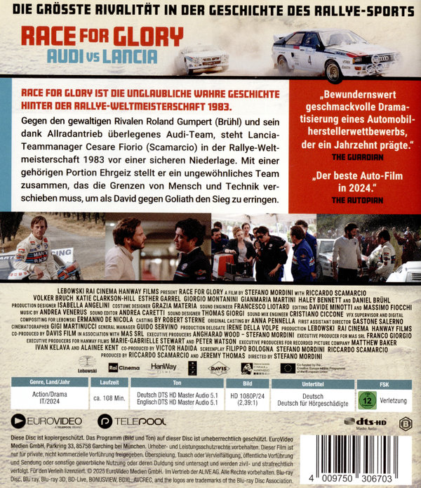 RACE FOR GLORY ist die unglaubliche wahre Geschichte hinter der Rallye-Weltmeisterschaft 1983. Gegen den gewaltigen Rivalen Roland Gumpert (Daniel Brühl) und sein, dank Allrad Antrieb überlegenes Audi-Team, steht Lancia-Teammanager Cesare Fiorio (Riccardo Scamarcio) in der Rallye-Weltmeisterschaft 1983 vor einer sicheren Niederlage. Mit einer gehörigen Portion Ehrgeiz stellt er ein ungewöhnliches Team zusammen, das die Grenzen von Mensch und Technik verschieben muss, um als David gegen Goliath den Sieg zu erringen.