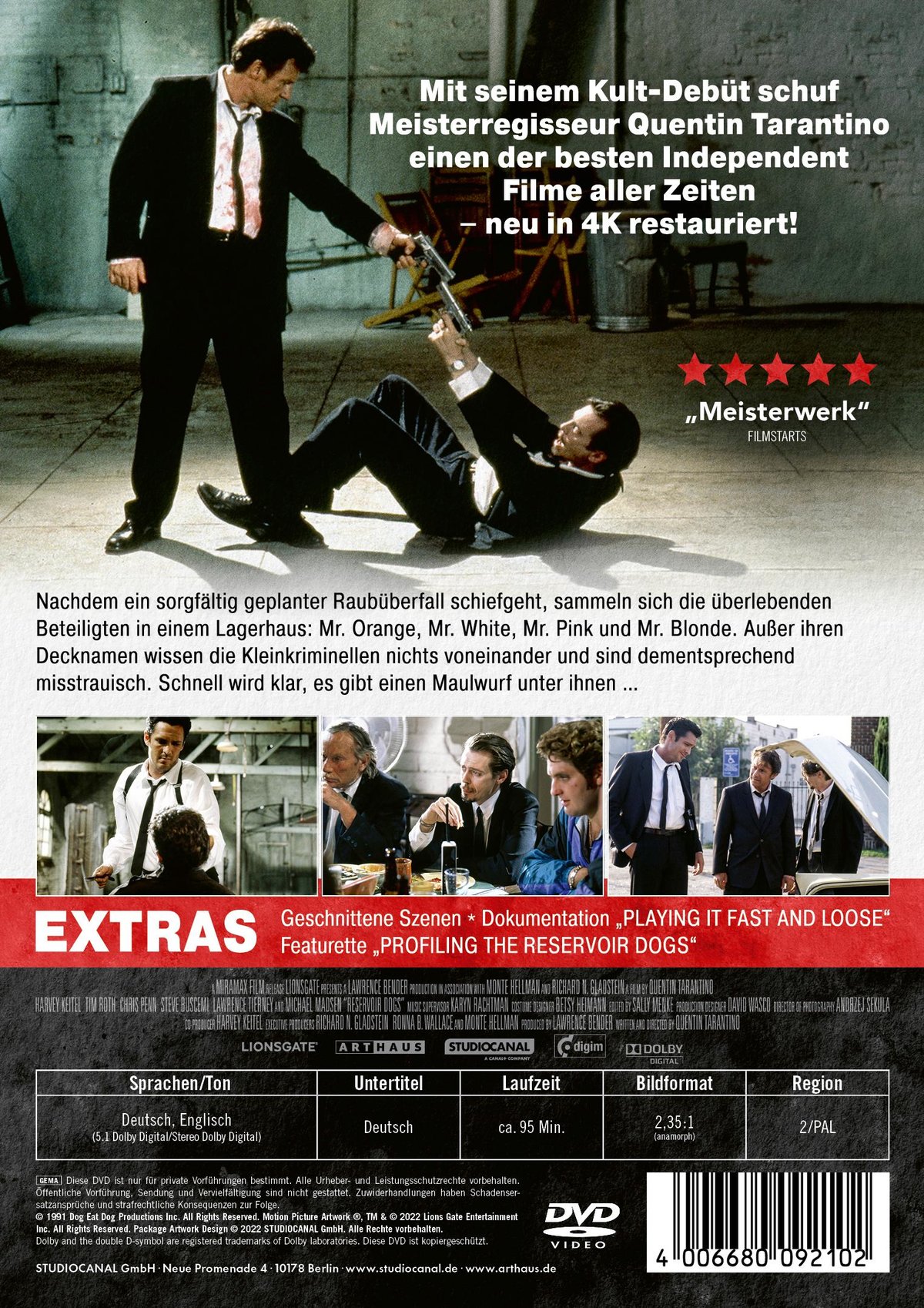 Quentin Tarantinos Debüt ist längst zum absoluten Kultklassiker aufgestiegen und gilt als einer der besten Independent-Filme aller Zeiten. Die unkonventionelle Erzählweise, die zitatwürdigen Dialogen und die gnadenlose Brutalität werden perfekt ergänzt von einem großartig aufspielenden Ensemble-Cast bestehend aus Harvey Keitel, Michael Madsen, Tim Roth, Steve Buscemi, Chris Penn und Quentin Tarantino selbst. Nach seiner Premiere beim Sundance Film Festival wurde Reservoir Dogs auch bei Cannes, Sitges und Toronto im Programm gezeigt und erhielt bei den Independent Spirit Awards drei Nominierungen. Eine Auszeichnung gab es für Steve Buscemi als bester männlicher Nebendarsteller.