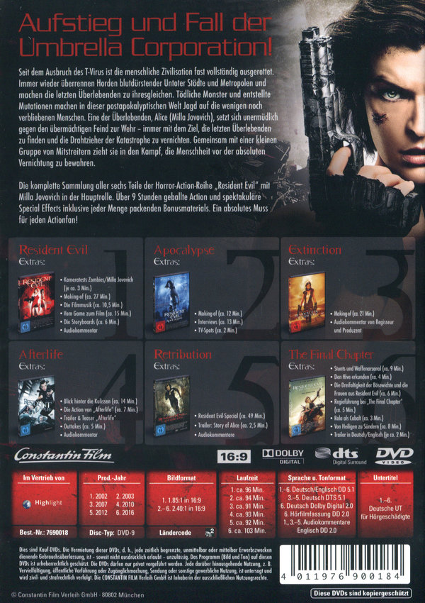 14 Jahre Zombies, Mutanten und eine unermüdlich kämpfende Heldin!Seit dem Ausbruch des T-Virus ist die menschliche Zivilisation fast vollständig ausgerottet. Immer wieder überrennen Horden blutdürstender Untoter Städte und Metropolen und machen die letzten Überlebenden zu ihresgleichen. Tödliche Monster und entstellte Mutationen machen in dieser postapokalyptischen Welt Jagd auf die wenigen noch verbliebenen Menschen. Eine der Überlebenden, Alice (Milla Jovovich), setzt sich unermüdlich gegen den übermächtigen Feind zur Wehr - immer mit dem Ziel, die letzten Überlebenden zu finden und die Drahtzieher der Katastrophe zu vernichten. Gemeinsam mit einer kleinen Gruppe von Mitstreitern zieht sie in den Kampf, die Menschheit vor der absoluten Vernichtung zu bewahren.Die komplette Sammlung aller sechs Teile der Horror-Action-Reihe "Resident Evil" mit Milla Jovovich in der Hauptrolle. Über 9 Stunden geballte Action und spektakuläre Special Effects inklusive jeder Menge packenden Bonusmaterials.Ein absolutes Muss für jeden Actionfan!Enthält folgende 6 Filme:Resident EvilAlice und Rain müssen ein Team in eine riesige unterirdische Genforschungsfabrik führen, in welcher zuvor ein tödlicher Virus das gesamte Forschungspersonal getötet und als blutrünstige Untote wieder auferstehen lies.Resident Evil: ApocalypseGeführt von Alice, versucht ein kleiner Trupp Überlebender, aus der Stadt zu entkommen. Doch die "Umbrella Corporation" setzt die hoch entwickelte...