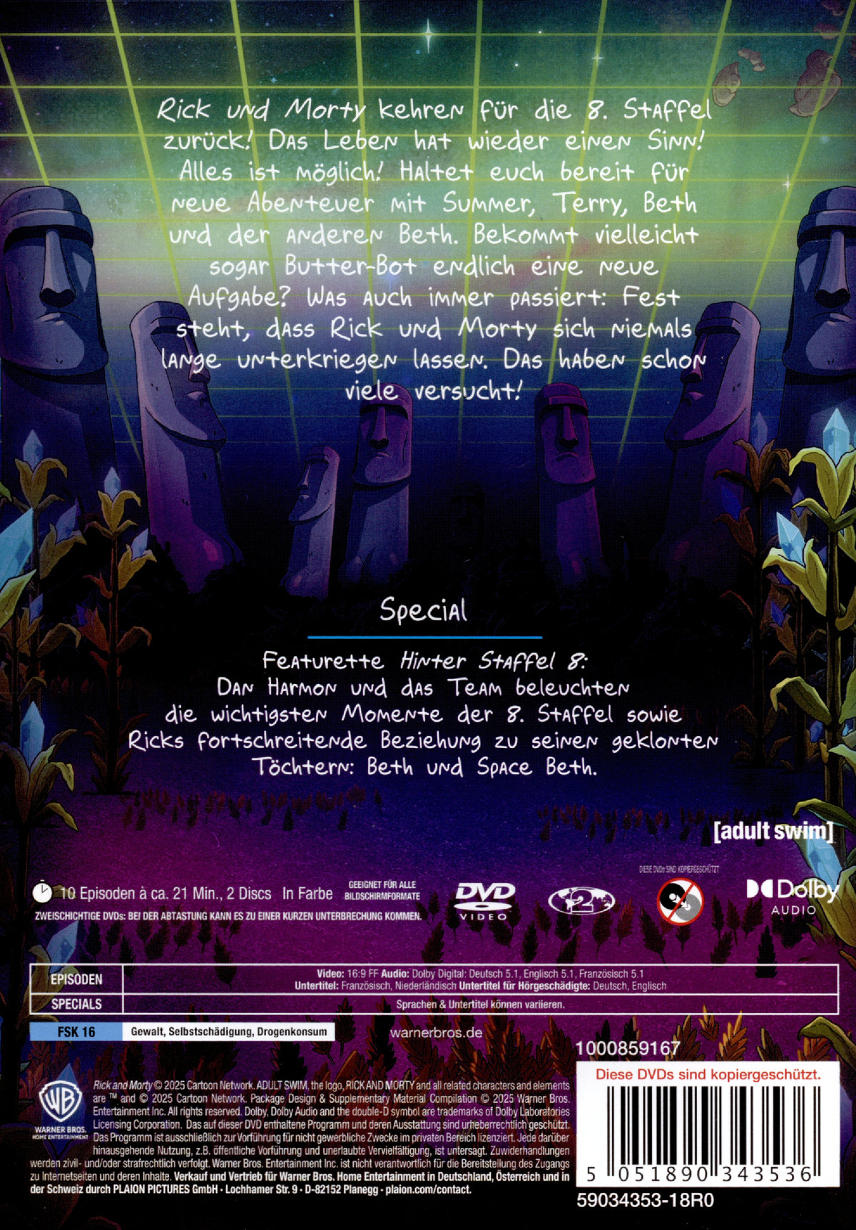 Rick und Morty sind mit Staffel 8 zurück! Das Leben hat wieder einen Sinn! Alles ist möglich! Freut euch auf die Abenteuer mit Summer, Jerry, Beth und der anderen Beth. Bekommt Butter Bot vielleicht eine neue Aufgabe? Egal was passiert, Rick und Morty lassen sich nicht lange aufhalten. Man hat es versucht!