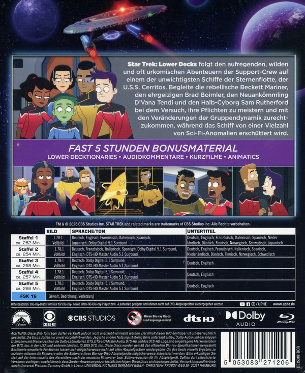 "Star Trek: Lower Decks" folgt den aufregenden, wilden und oft urkomischen Abenteuern der Support-Crew auf einem der unwichtigsten Schiffe der Sternenflotte, der U.S.S. Cerritos. Begleite die rebellische Beckett Mariner, den ehrgeizigen Brad Boimler, den Neuankömmling D'Vana Tendi und den Halb-Cyborg Sam Rutherford bei dem Versuch, ihre Pflichten zu meistern und mit den Veränderungen der Gruppendynamik zurechtzukommen, während das Schiff von einer Vielzahl von Sci-Fi-Anomalien erschüttert wird.Dieses Set enthält alle 50 Episoden auf 10 Blu-rays mit fast 5 Stunden Bonusmaterial