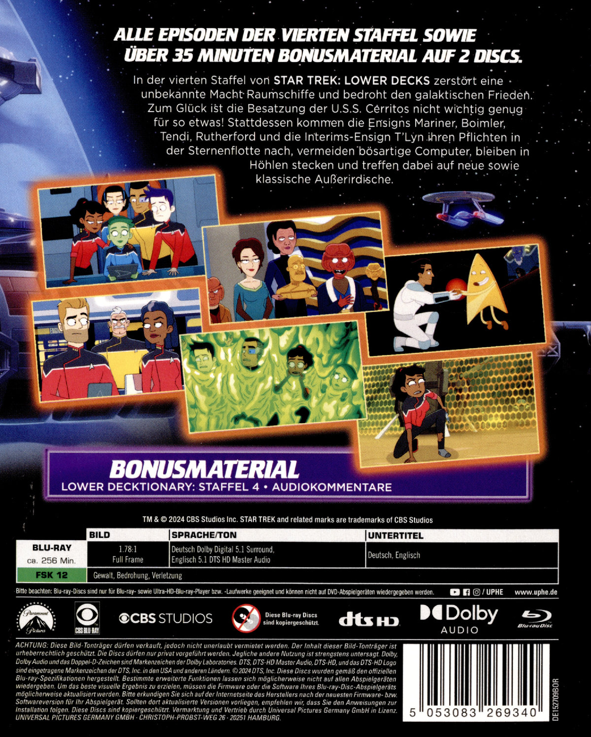 In der vierten Staffel von "STAR TREK: Lower Decks" zerstört eine unbekannte Macht Raumschiffe und bedroht den galaktischen Frieden. Zum Glück ist die Besatzung der U.S.S. Cerritos nicht wichtig genug für so etwas! Stattdessen kommen die Ensigns Mariner, Boimler, Tendi, Rutherford und die Interims-Ensign T'Lyn ihren Pflichten in der Sternenflotte nach, vermeiden bösartige Computer, bleiben in Höhlen stecken und treffen dabei auf neue sowie klassische Außerirdische.Alle Episoden der vierten Staffel sowie über 35 Minuten Bonusmaterial auf 2 DiscsEpisodenübersicht- Twovix- Keine Knochen, aber muss trotzdem fliehen- In der Wiege Vexilons- Etwas Geliehenes, etwas Grünes- Empathische Irrtümer- Parth Ferengis Lieblingsort- Noch ein paar Abzeichen mehr- Höhlen- Der innere Kampf- Alte Freunde, neue Planeten