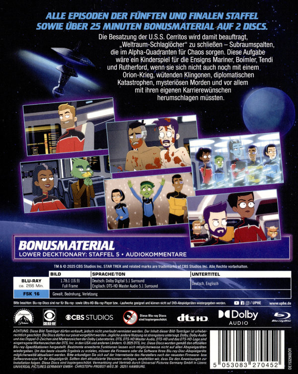 Die Besatzung der U.S.S. Cerritos wird damit beauftragt, "Weltraum-Schlaglöcher" zu schließen - Subraumspalten, die im Alpha-Quadranten für Chaos sorgen. Diese Aufgabe wäre ein Kinderspiel für die Ensigns Mariner, Boimler, Tendi und Rutherford, wenn sie sich nicht auch noch mit einem Orion-Krieg, wütenden Klingonen, diplomatischen Katastrophen, mysteriösen Morden und vor allem mit ihren eigenen Karrierewünschen herumschlagen müssten.Alle Episoden der fünften und finalen Staffel sowie über 25 Minuten Bonusmaterial auf 2 DiscsEpisodenübersichtDisc 1- Dos Cerritos- Grüntöne- The Best Exotic Nanite Hotel- Von Brüdern und anderen Herausforderungen- Sternenbasis 80?!Disc 2- Von Göttern und Kanten- Die Zeitdilatation- Upper Decks- Die Spalt-Mission- Die neue nächste Generation