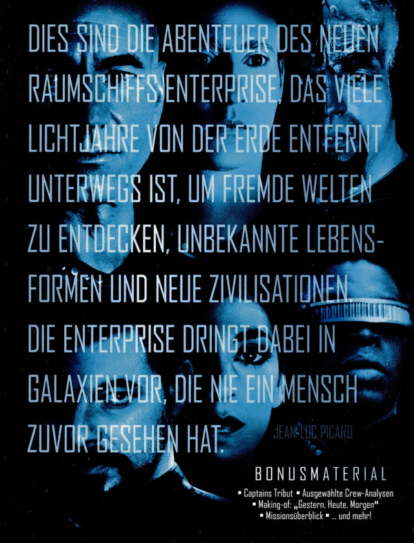 Missionsüberblick, Ausgewählte Crew-Analysen, Sektions-Briefings, Aus dem Starfleet-Archiv, Die Entstehung einer Legende, Captains Tribut, Starfleet-Erinnerungen und besondere Momente, Making of: "Gestern, Heute, Morgen",u.v.m., Tonformate siehe Einzelteile!