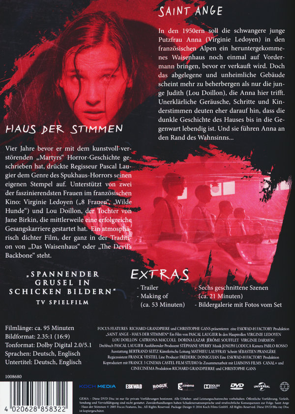 In den 1950ern soll die schwangere junge Putzfrau Anna (Virginie Ledoyen) in den französischen Alpen ein heruntergekommenes Waisenhaus noch einmal auf Vordermann bringen, bevor es verkauft werden soll. Doch das abgelegene und unheimliche Gebäude scheint mehr zu beherbergen als nur die junge Judith (Lou Doillon), die Anna hier vorfindet. Unerklärliche Geräusche, Schritte und Kinderstimmen deuten vielmehr darauf hin, dass die unheilvolle Geschichte des Hauses bis in die Gegenwart hineinwirkt. Und sie führen Anna an den Rand des Wahnsinns... Vier Jahre bevor er mit dem kunstvoll-verstörenden "Martyrs" Horror-Geschichte geschrieben hat, drückte Regisseur Pascal Laugier dem Genre des Spukhaus-Horrors seinen stilistischen Stempel auf. Unterstützt von zwei der faszinierendsten Frauen im französischen Unterhaltungsbetrieb: Virginie Ledoyen ("8 Frauen", "Wilde Hunde") und Jane Birkin-Tochter Lou Doillon, die mittlerweile eine erfolgreiche Gesangskarriere gestartet hat. Ein atmosphärisch dichter Film, der ganz in der Tradition von "Das Waisenhaus" oder "The Devil’s Backbone" steht.