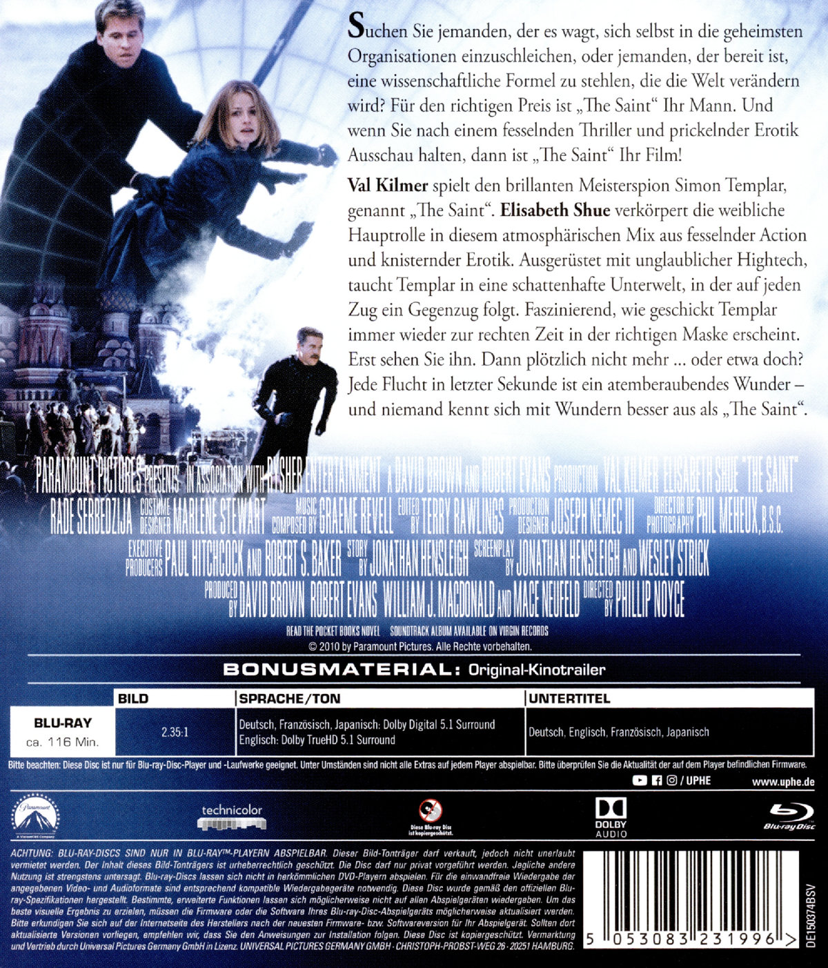 Suchen Sie jemanden, der es wagt, sich selbst in die geheimsten Organisationen einzuschleichen, oder jemanden, der bereit ist, eine wissenschaftliche Formel zu stehlen, die die Welt verändern wird? Für den richtigen Preis ist "The Saint" Ihr Mann.Und wenn Sie nach einem fesselnden Thriller und prickelnder Erotik Ausschau halten, dann ist "The Saint" Ihr Film!Val Kilmer spielt den brillanten Meisterspion Simon Templar, genannt "The Saint". Elisabeth Shue verkörpert die weibliche Hauptrolle in diesem atmosphärischen Mix aus fesselnder Action und knisternder Erotik. Ausgerüstet mit unglaublicher Hightech taucht Templar in eine schattenhafte Unterwelt, in der auf jeden Zug ein Gegenzug folgt.Faszinierend, wie geschickt Templar immer wieder zur rechten Zeit in der richtigen Maske erscheint. Gerade sehen Sie ihn. Jetzt sehen Sie ihn nicht ... oder etwa doch? Jede Flucht in letzter Sekunde ist ein atemberaubendes Wunder - und niemand kennt Wunder besser als "The Saint".