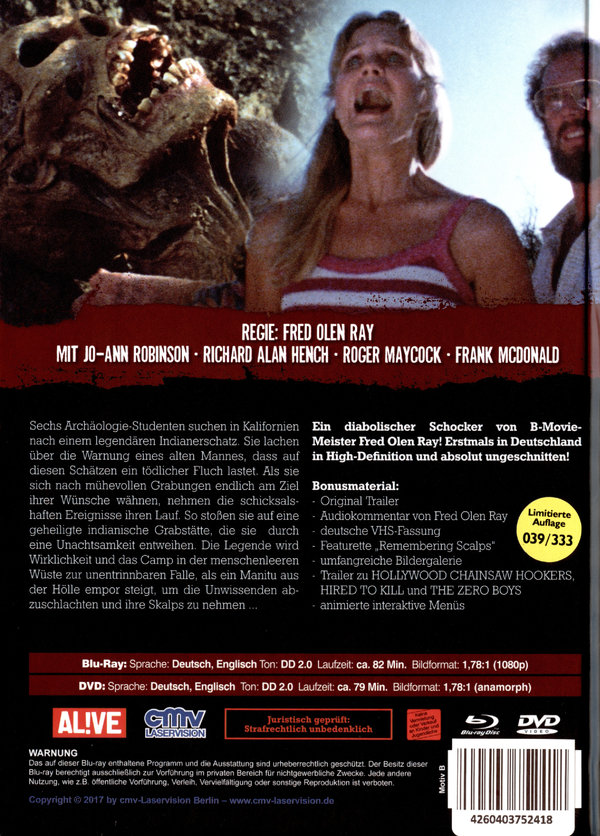 Original Trailer; Audiokommentar von Fred Olen Ray; Featurette "Remembering Scalps"; umfangreiche Bildergalerie; Trailer zu HOLLYWOOD CHAINSAW HOOKERS; HIRED TO KILL und THE ZERO BOYS ; animierte interaktive Menus