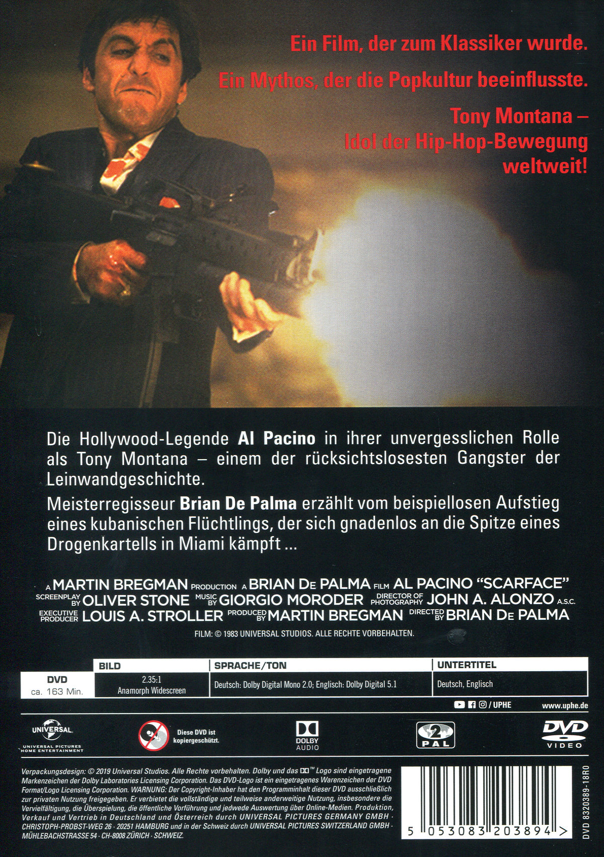 Ein Film, der zum Klassiker wurde. Ein Mythos, der die Popkultur beeinflusste! Tony Montana - Idol der Hip-Hop-Bewegung weltweit!Die Hollywood-Legende Al Pacino in seiner unvergesslichen Rolle als Tony Montana - einem der rücksichtlosesten Gangster der Leinwandgeschichte. Meisterregisseur Brian De Palma erzählt vom beispiellosen Aufstieg eines kubanischen Flüchtlings, der sich gnadenlos an die Spitze eines Drogenkartells in Miami kämpft ...