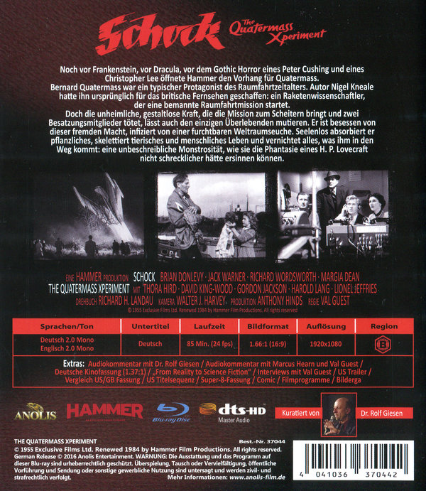 Schock bildet den spannenden Auftakt zur Trilogie um den Wissenschaftler Dr. Quatermass, inszeniert von dem Duo Nigel Kneal und Val Guest die sich auch schon für den bereits erhältlichen Yeti, der Schneemensch verantwortlich zeigten.