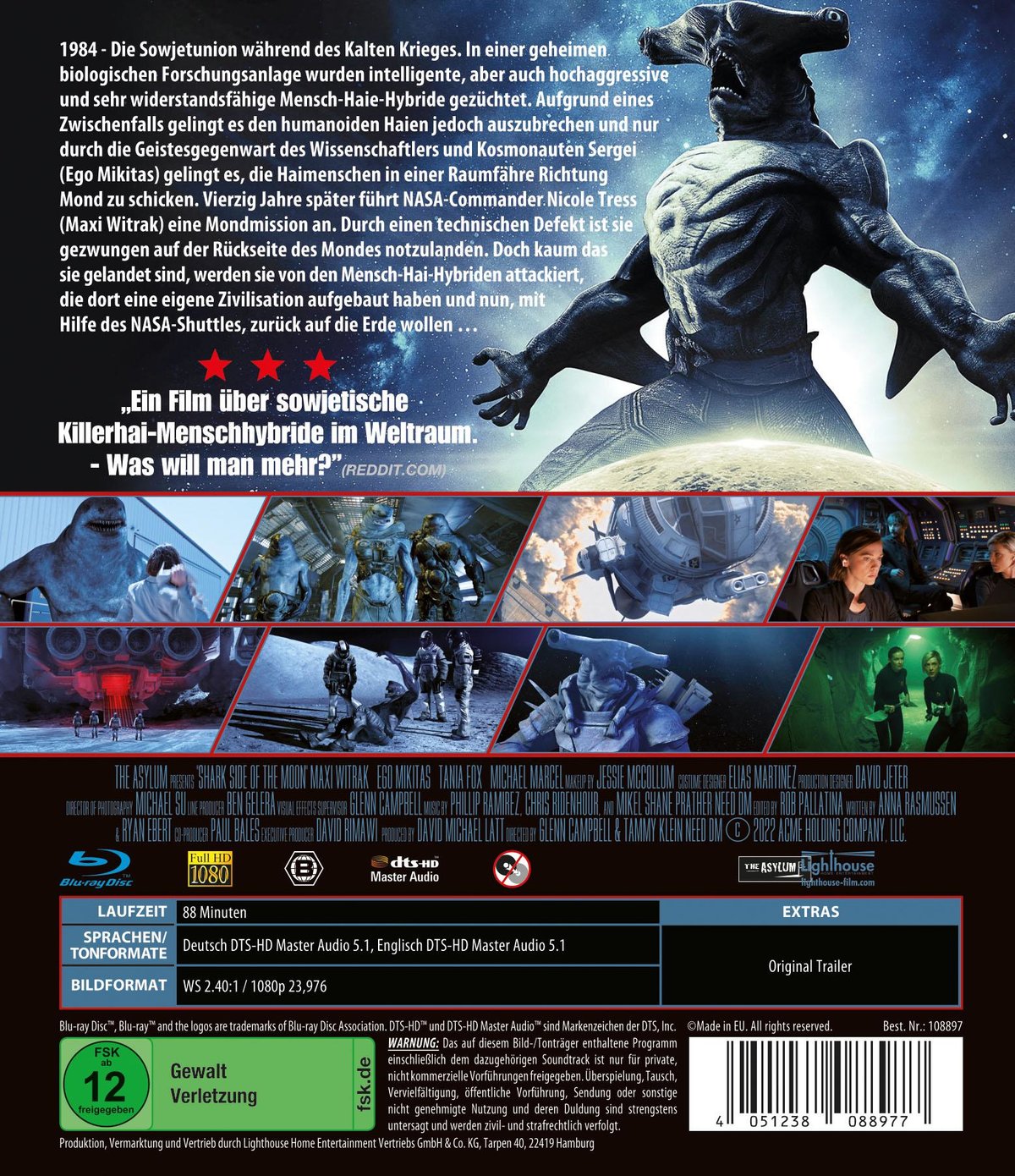 1984 - Die Sowjetunion während des Kalten Krieges. In einer geheimen biologischen Forschungsanlage wurden intelligente, aber auch hochaggressive und sehr widerstandsfähige Mensch-Haie-Hybride gezüchtet. Aufgrund eines Zwischenfalls gelingt es den humanoiden Haien jedoch auszubrechen und nur durch die Geistesgegenwart des Wissenschaftlers und Kosmonauten Sergei (Ego Mikitas) gelingt es, die Haimenschen in einer Raumfähre Richtung Mond zu schicken. Vierzig Jahre später führt NASA-Commander Nicole Tress (Maxi Witrak) eine Mondmission an. Durch einen technischen Defekt ist sie gezwungen auf der Rückseite des Mondes notzulanden. Doch kaum das sie gelandet sind, werden sie von den Mensch-Hai-Hybriden attackiert, die dort eine eigene Zivilisation aufgebaut haben und nun, mit Hilfe des NASA-Shuttles, zurück auf die Erde wollen …