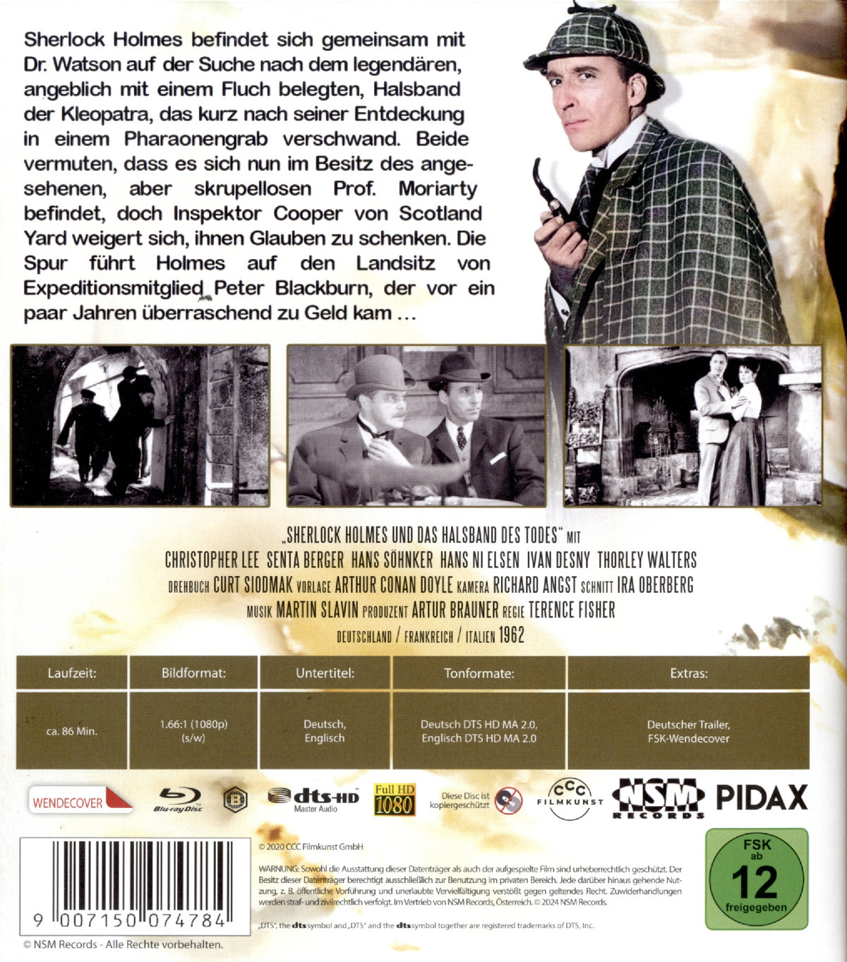 Sherlock Holmes befindet sich gemeinsam mit Dr. Watson auf der Suche nach dem legendären, angeblich mit einem Fluch belegten, Halsband der Kleopatra, das kurz nach seiner Entdeckung in einem Pharaonengrab verschwand. Beide vermuten, dass es sich nun im Besitz des angesehenen, aber skrupellosen Prof. Moriarty befindet, doch Inspektor Cooper von Scotland Yard weigert sich, ihnen Glauben zu schenken. Die Spur führt Holmes auf den Landsitz von Expeditionsmitglied Peter Blackburn, der vor ein paar Jahren überraschend zu Geld kam … Mit dem britischen Star Christopher Lee als Sherlock Holmes, Hans Söhnker als gerissenem Professor und Senta Berger als attraktivem Blickfang. Das amüsante Detektivspiel unter Regie des Hammer-Regisseurs Terence Fisher kommt dem Reiz der Detektivabenteuer von Arthur Canon Doyle sehr nahe, da besonderer Wert auf Nervenkitzel und Krimi-Atmosphäre gelegt wird.