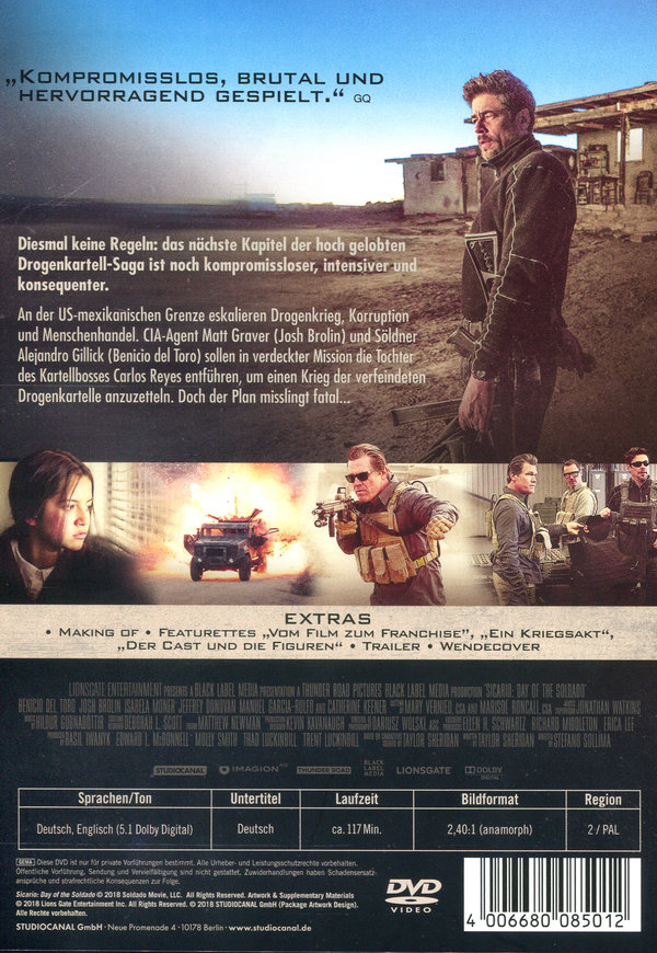 Die Fortsetzung des fesselnden Thrillers "Sicario" treibt die Spannung auf ein Maximum: Im komplexen Kampf zwischen Macht und Gier verschwimmen die Grenzen zwischen Gut und Böse. in den Hauptrollen brillieren erneut Oscar-Preisträger Benicio Del Toro ("Traffic") und der Oscar-nominierte Josh Brolin ("No Country for Old Men") - diesmal an der Seite von Newcomerin Isabela Moner ("Transformers: The Last Knight").