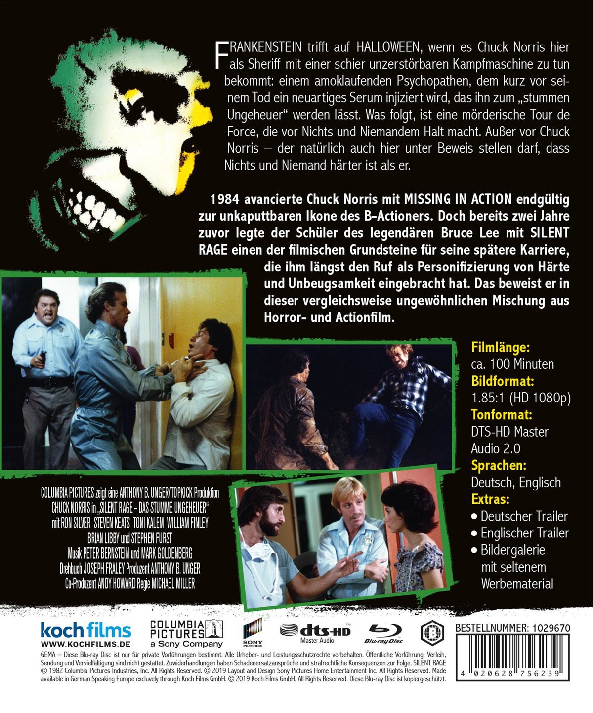 1984 avancierte Chuck Norris mit MISSING IN ACTION endgültig zur unkaputtbaren Ikone des B-Actioners. Doch bereits zwei Jahre zuvor legte der Schüler des legendären Bruce Lee mit SILENT RAGE einen der filmischen Grundsteine für seine spätere Karriere, die ihm längst den Ruf als Personifizierung von Härte und Unbeugsamkeit eingebracht hat. Das beweist er in dieser vergleichsweise ungewöhnlichen Mischung aus Horror- und Actionfilm, die Koch Films erstmals auch in Deutschland ungekürzt zur Veröffentlichung bringt.