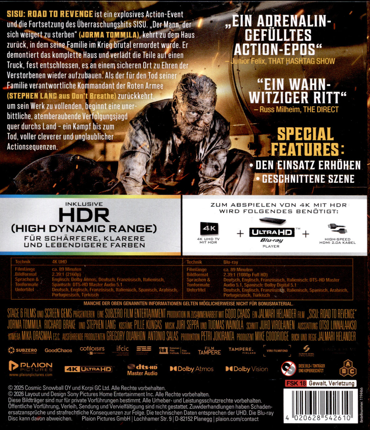 SISU: ROAD TO REVENGE ist ein intensives, mitreißendes Action-Spektakel – die Fortsetzung des Überraschungshits SISU. „Der Mann, der nicht sterben will“ (Jorma Tommila) kehrt in das Haus zurück, in dem seine Familie während des Krieges brutal ermordet wurde. Er zerlegt es in seine Einzelteile, verlädt es auf einen Lastwagen und ist fest entschlossen, es an einem sicheren Ort zu Ehren seiner Familie wieder aufzubauen. Doch als der Kommandant der Roten Armee zurückkehrt, der seine Familie getötet hat (Stephen Lang aus DON’T BREATHE) – fest entschlossen, die Arbeit zu Ende zu bringen – beginnt eine unerbittliche, atemberaubende Verfolgungsjagd quer durch das Land. Ein Kampf auf Leben und Tod, gespickt mit cleveren, schier unglaublichen Actionszenen.